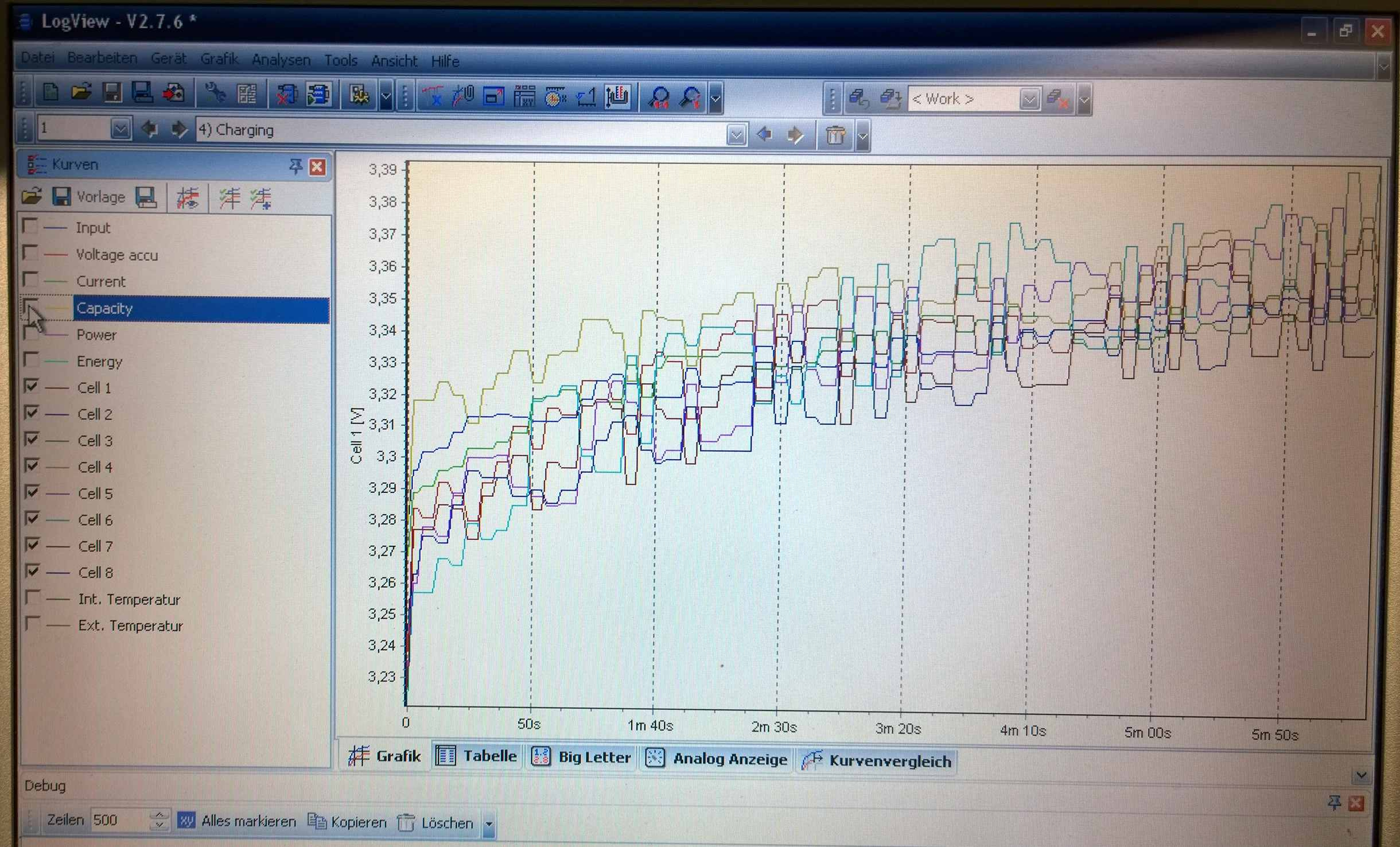 Augenscheinlich hat es geklappt, ohne manuell nach zu helfen alle 8 Zellen bei den eingestellten 3,9V
