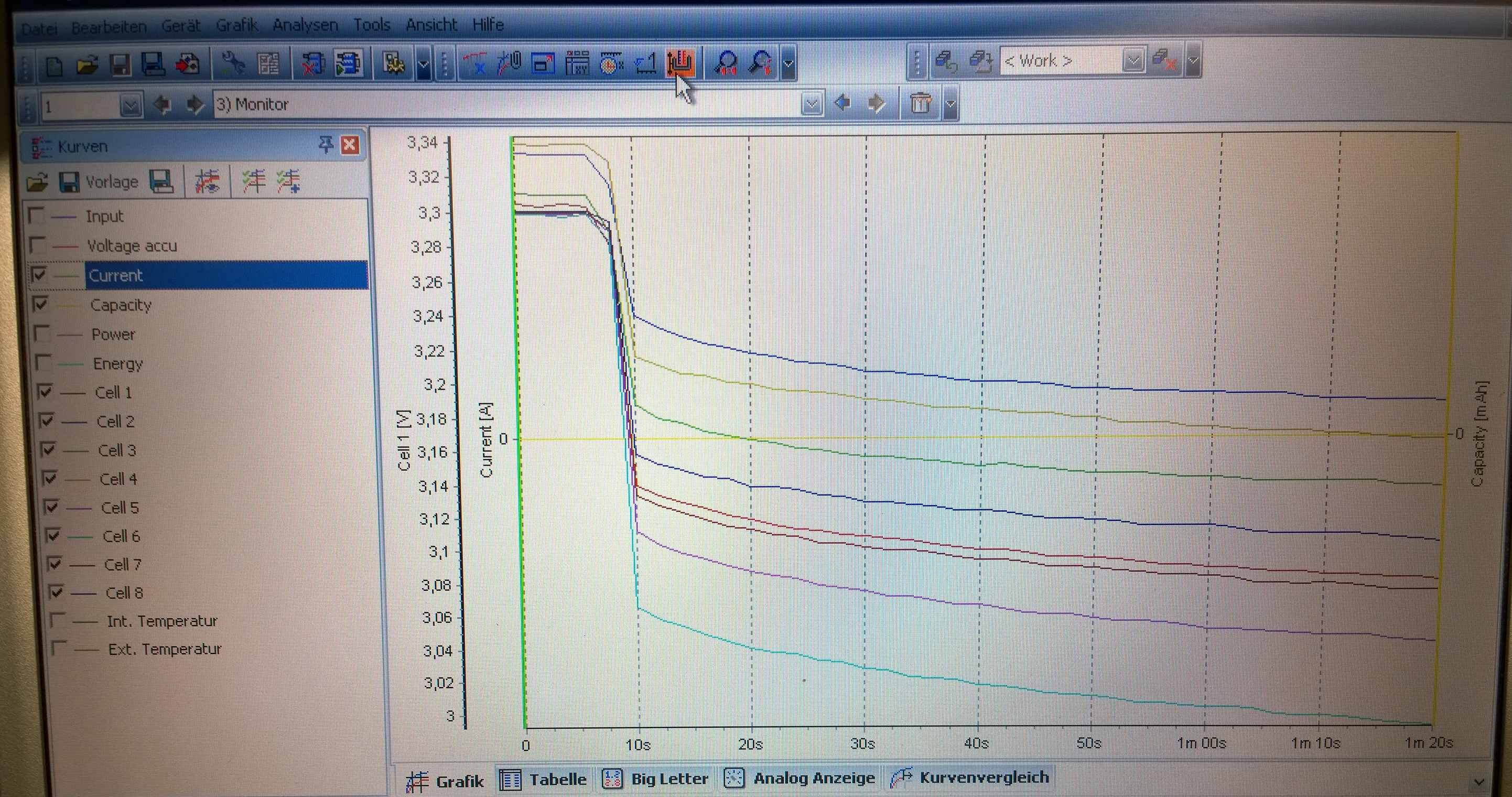 Laden kann ich damit aktuell mit 7,5A und entladen mit externen Widerstand mit 20A , das sind dann schon 1/2C