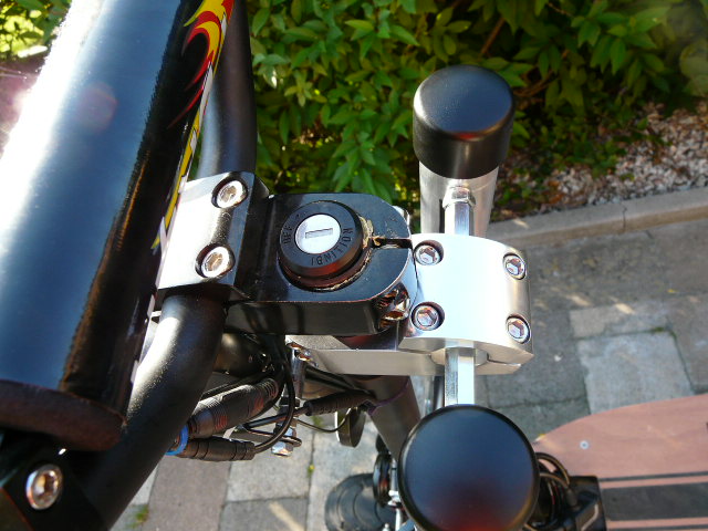 Meine beiden Alurohre sind reine Attrappen und habe keine echte Funktion. Es sind eine rein optische Verbesserung um einen robusteren Eindruck zu bekommen und um die Lenksäule etwas schräger erscheinen zu lassen, eben wie beim neuen Bossman. Damit sieht man auch wie man mit ein paar Alurohren aus dem Baumarkt und ein paar Rohrschellen den Scooter optisch verändern kann. Rein technisch gibt es überhaupt keine Veränderung am Scooter. Die Rohre sind an zwei Stellen nur mit der Lenksäule verbunden. Den Scheinwerfer hatte durch eine LED Version erstetzt, diesen habe ich ganz nach oben verschoben und durch eine zweiten daneben ergänzt. Den zweiten habe ich aber nicht angeschlossen, kann man natürlich noch machen.