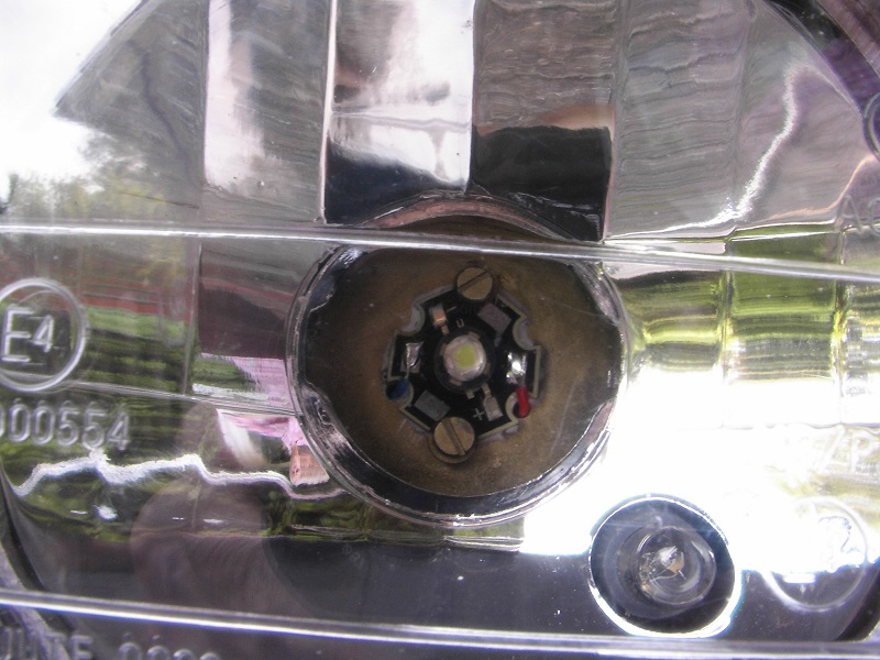 Der Scheinwerfer sieht schon toll aus, deshalb hatte ich die H4 Halogenbirne gegen eine 1W-LED mit Kühlkörper ausgetauscht. Das Prüfzeichen findest Du immer auf der Glasabdeckung.