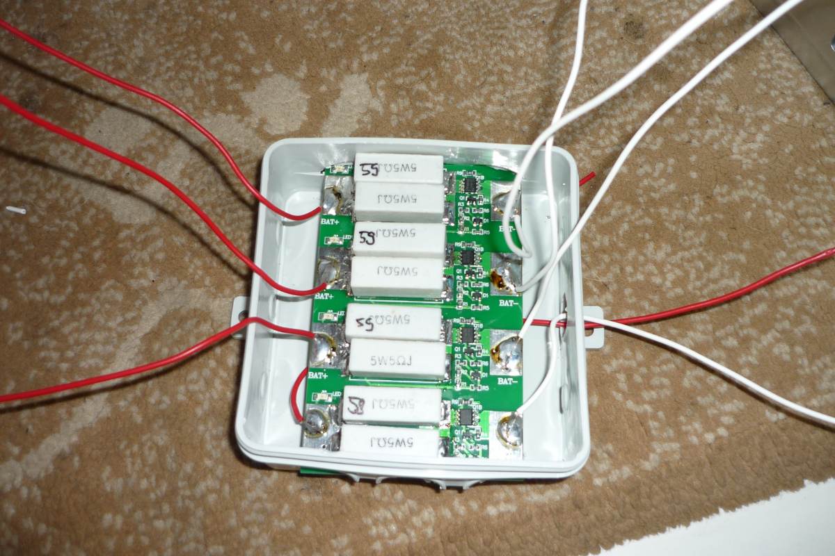 Also folgte eine Einzelladung bei 3.65V-3.8V mit Stromstärke 2A, bei Einsetzen des Balancers Reduktion der Stromstärke, bis der Balancer auch bei 1A leicht zu arbeiten anfing. Danach wieder das Netzgerät auf 14.6V oder mehr und wieder alle 4 Zellen in Reihe laden. Bei kleiner Stromstärke von 1A bis 1.5A solange nachfüttern, bis alle 4 LEDs leuchten.