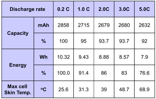 2 C ist auf Dauer möglich, wenn die Umgebungstemperatur nicht 30 Grad und höher ist. Als Beispiel mal die im unu verbaute Zelle. Die untere Zeile mit den Temperaturangaben ist dabei am wichtigsten. Abhängig von der Anfangstemperatur (25 Grad) und der Last kommen am Ende des Entladungsvorgangs unterschiedliche Temperaturen raus.