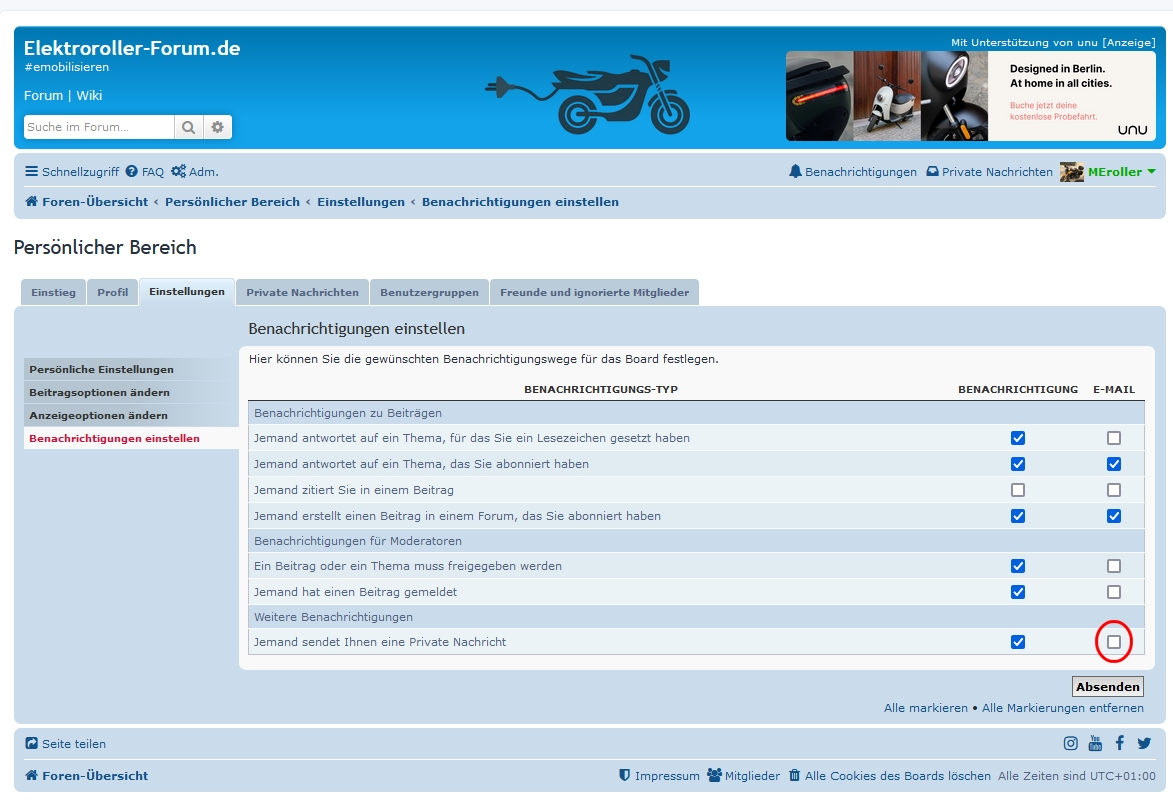 Bitte in den Persönlichen Gehen (rechts oben) und die gewünschten Benachrichtigungen wieder einstellen. Hier z.B. das Kästechen für die Email-Benachrichtigung bei neuer PN: