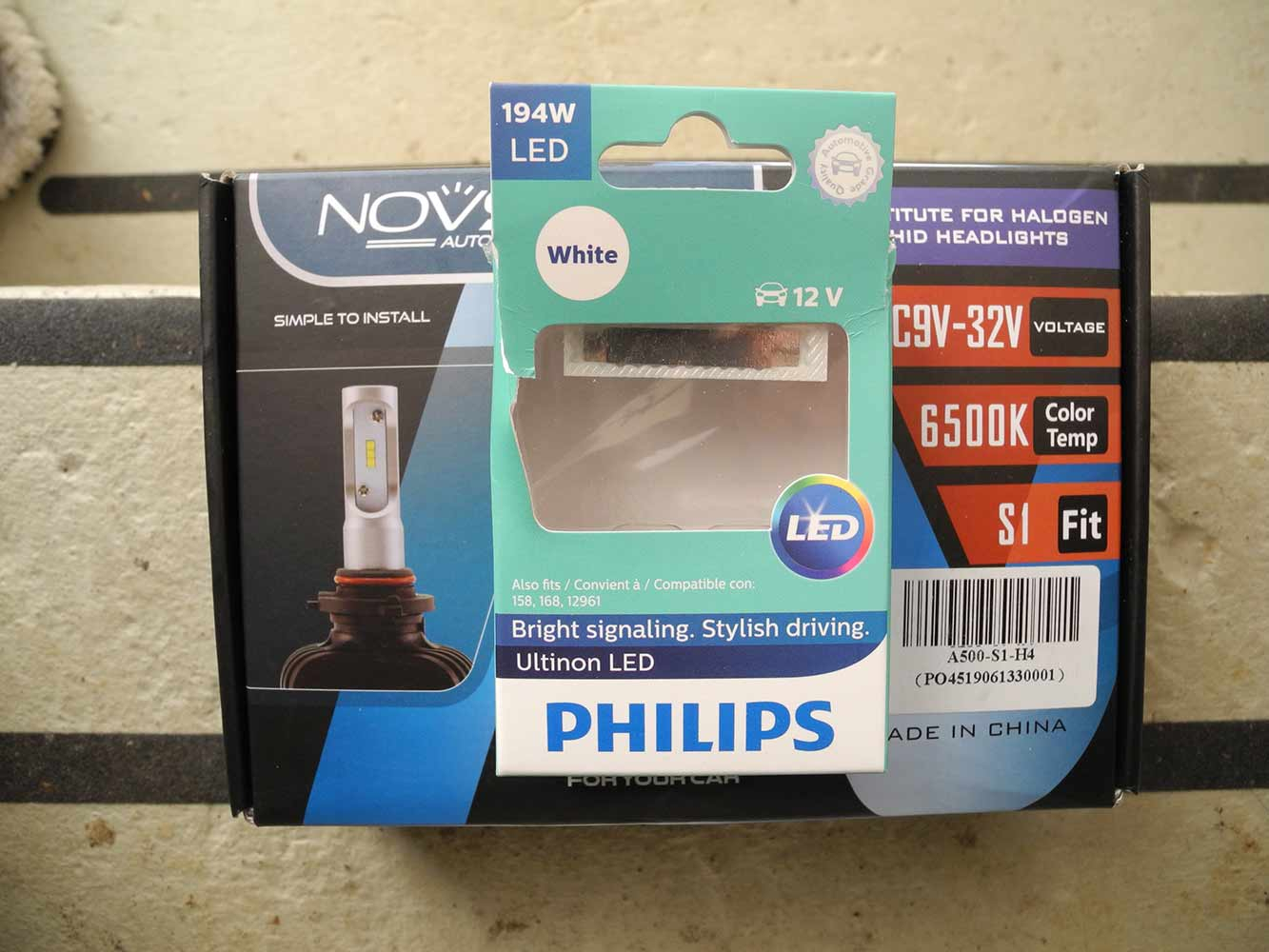 Ich konnte das ursprüngliche Set nicht mehr im Netz finden und habe daher den Ersatzartikel von „NovSIght“ gekauft, ein 2er Set, ich weiß nicht mehr wo, glaube aber eBay. Die Verpackung hat keine eindeutige Artikelbezeichung oder Nummer, benennt aber DC9-32, 6500K sowie S1. Ein nachträglicher angebrachter Aufkleber auf der Verpackung verrät dann mehr: „A500-S1-H4“. Die Lampe ist tatsächlich wie beschrieben einfachst auswechselbar. Das Standlicht wirkt danach wirklich wie ein rotes Teelicht - also auch ausgetauscht gegen eine in den USA bestellte Philips 194W „white“ LED mit 6000K. Wirkt sehr passend und harmonisch.