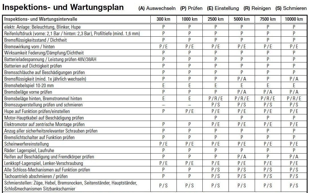 Was die Wartung, insbesondere im Hinblick auf noch bestehende Garantieleistungen angeht kann ich auch nur wie rollmops auf die Wartungsliste, welche auch bei mir Teil des Handbuchs des Rollers ist, verweisen.