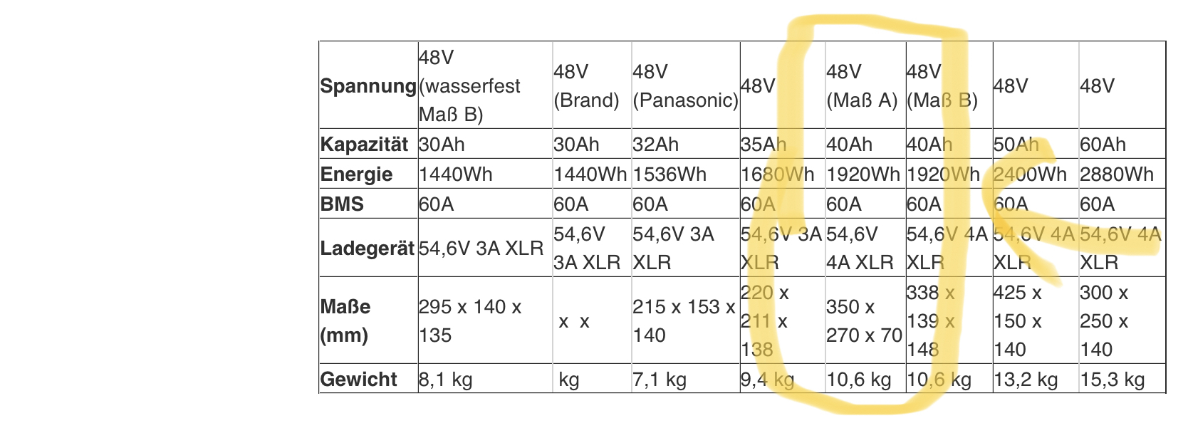 Z.b. 48V 50AH 3000W(5A). Oder 48V 55AH 3000W(5A)