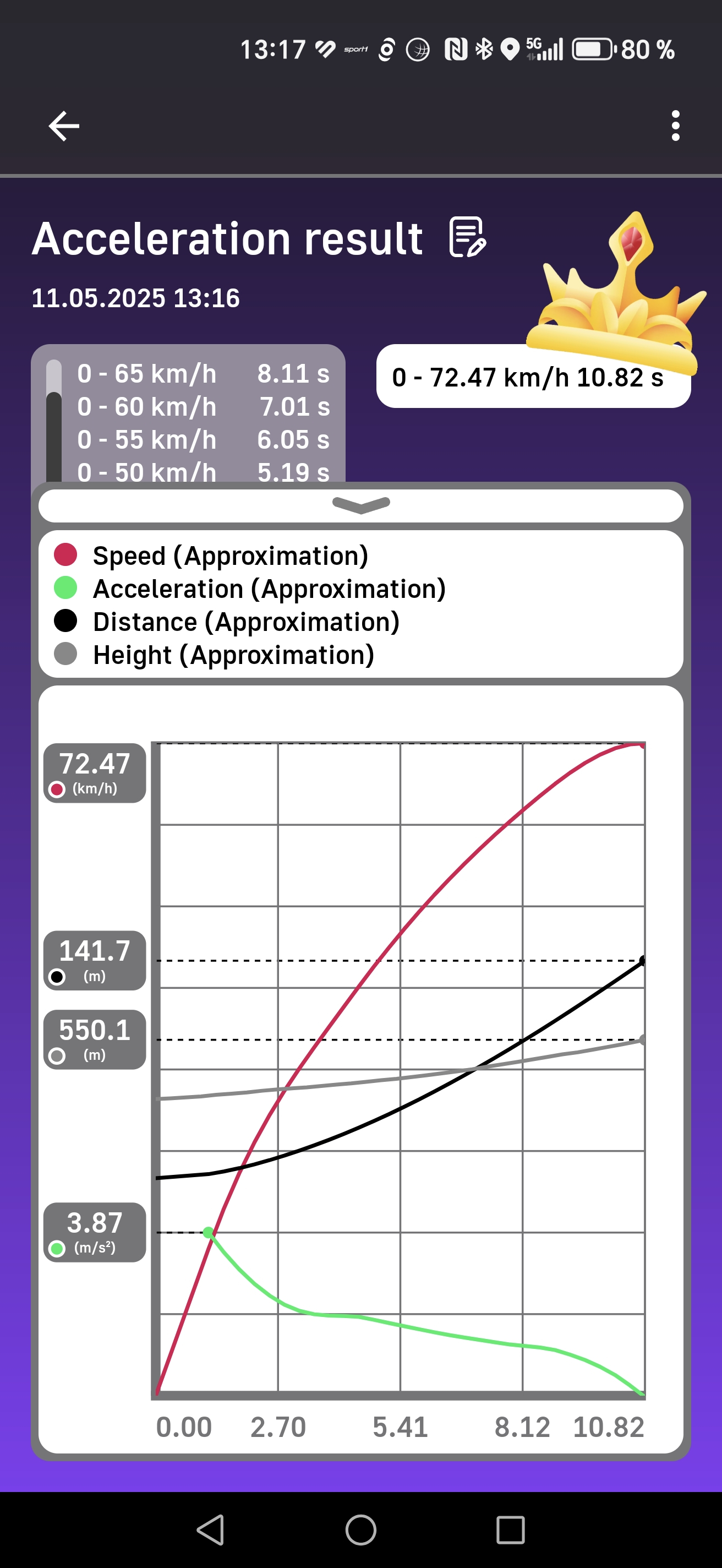 Hallo, weiß gar nicht, wie man die Werte in der Liste einträgt....also VMoto Explorer GPS Messung bei 62% Akkustand: 5,1sek, gemessen mit App Dragger am 11.05.25, s. Foto. Werte bei voller Ladung sicher noch einen Tick besser