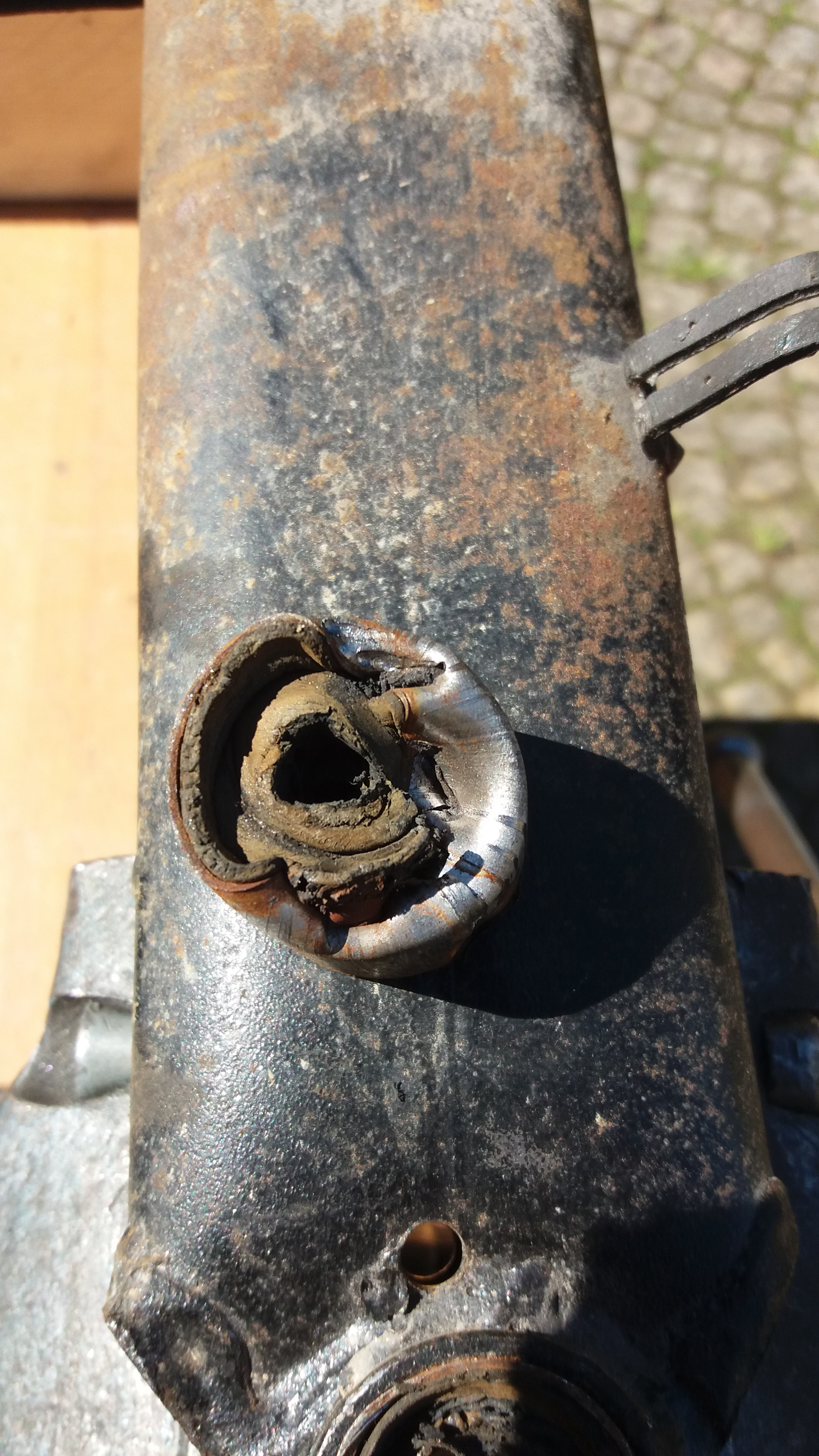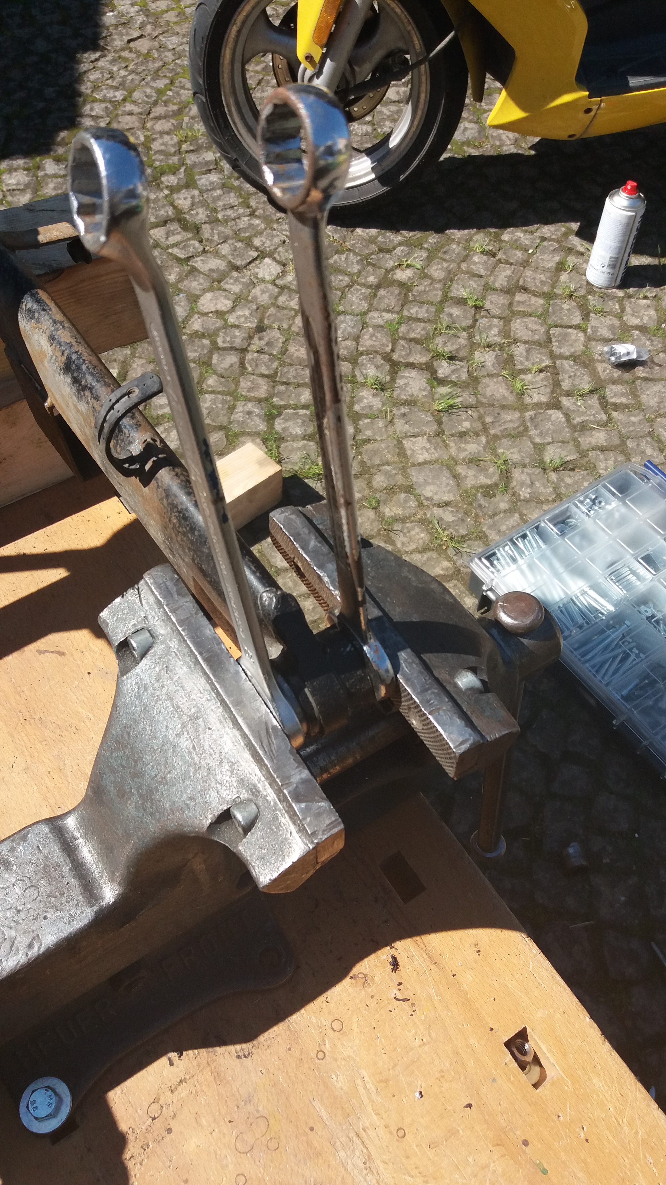 Das wieder einpressen mit dem Schraubstock war dagegen ein Kinderspiel. Zwei Gabelschlüssel und dann feste drehen.