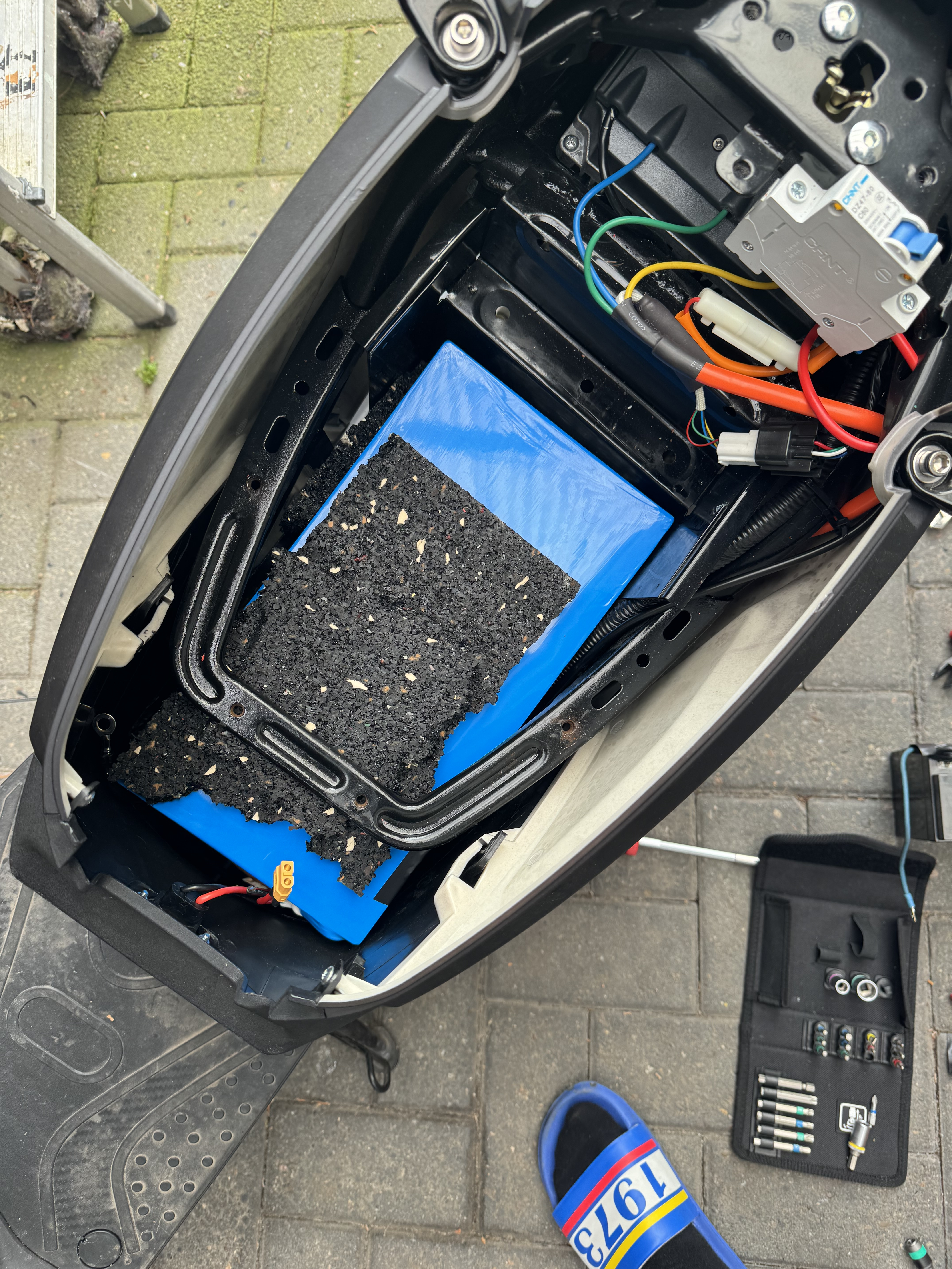 Ich werde jetzt erstmal keine weiteren Änderungen vornehmen, Kabel habe ich gelötet, isoliert und dann den Akku mit diesen Dämmatten (die man Unter die Waschmaschine legt) fixiert.
