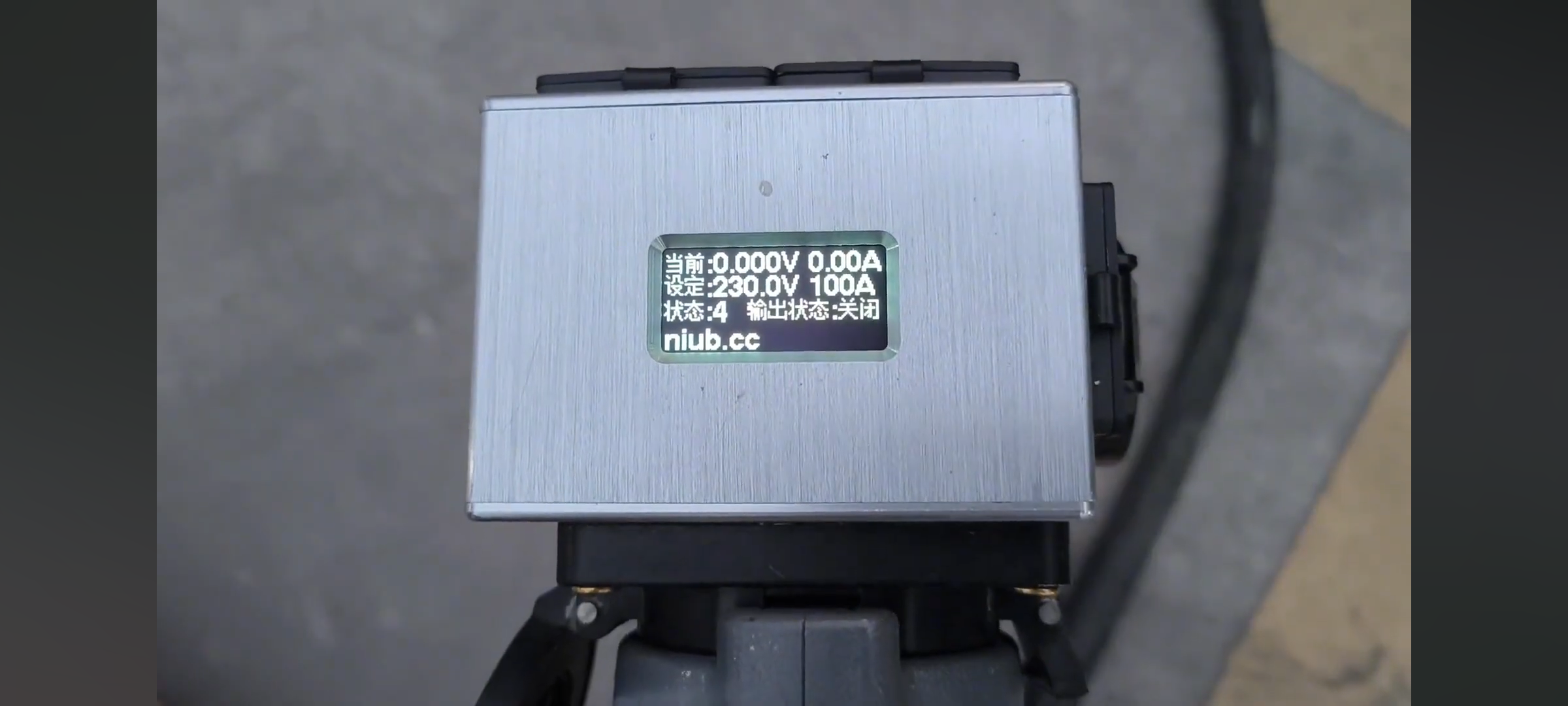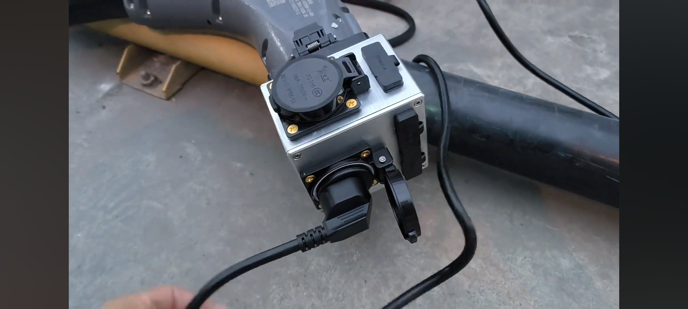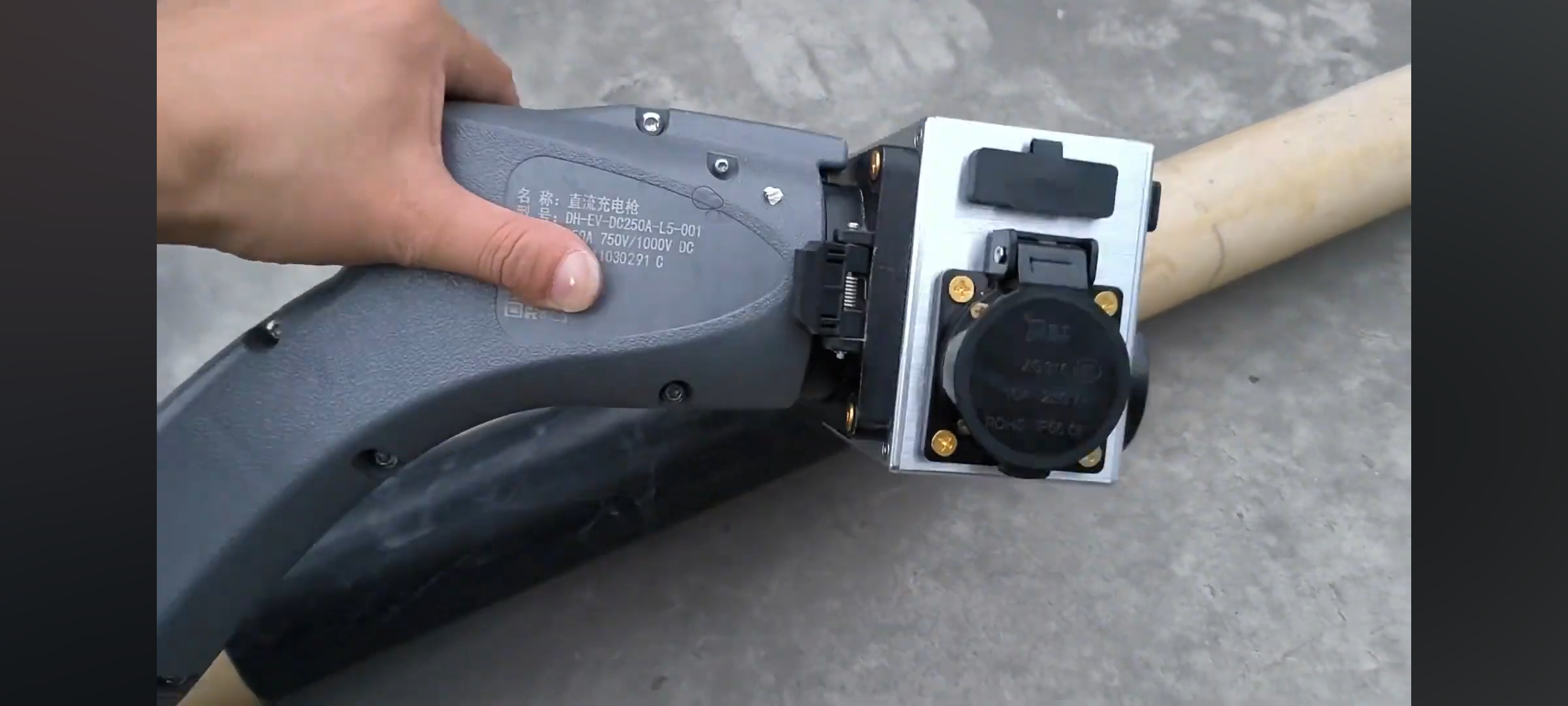 Teil 1: ein AC/DC-"Zapfgerät" (so nennen die Chinesen), das direkt mit dem Stecker von Ladesäule verbindet. Über Handy-App (Bluetooth) kann man Ausgangsspannung und Strom einstellen, z.B. 220V und 10A.