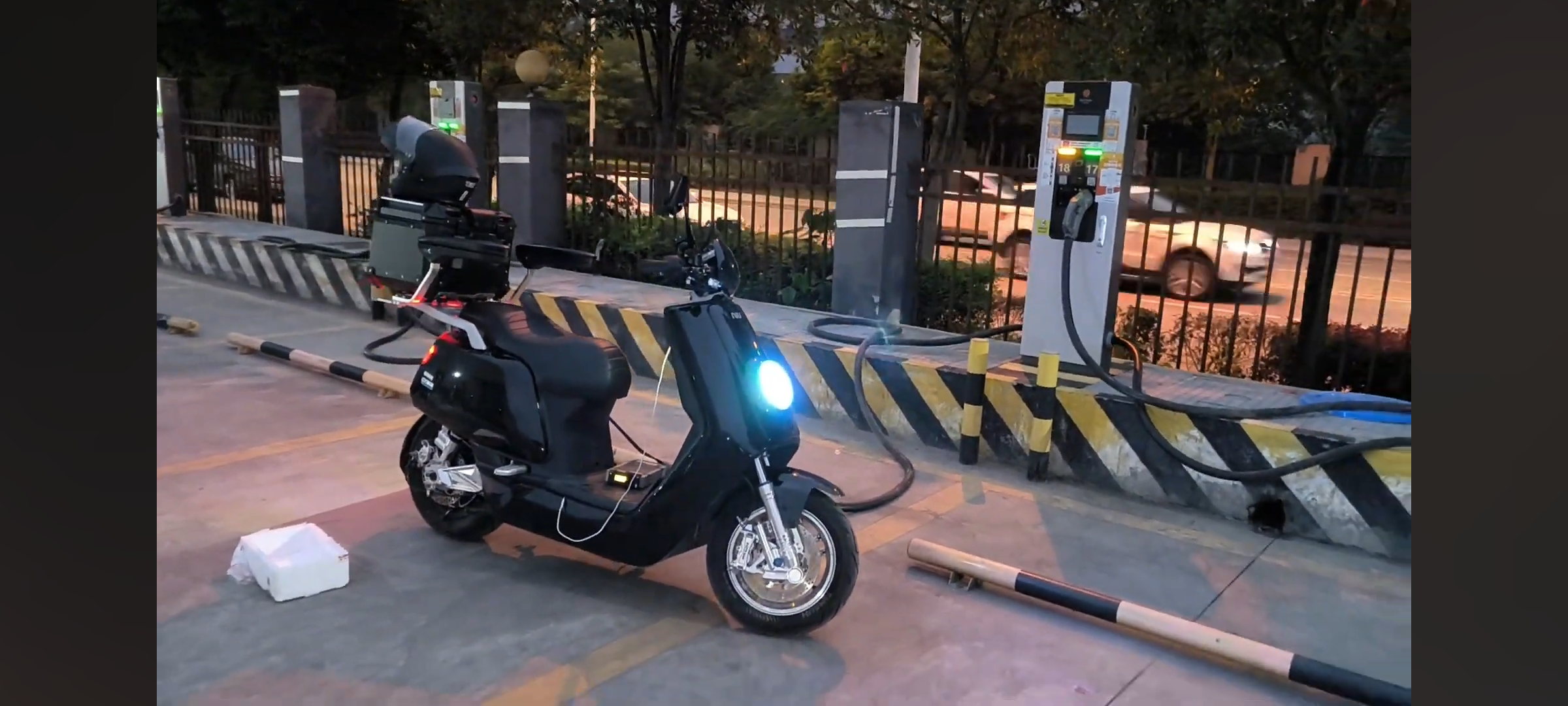 Ich habe mich schlau gemacht. In China fahren tatsächlich viele Leute mit dem Elektroroller längere Strecke oder auf Touren gehen. Dafür gibt es technische Lösung, dass man den Elektroroller auch an Auto-Ladesäule anschließt.