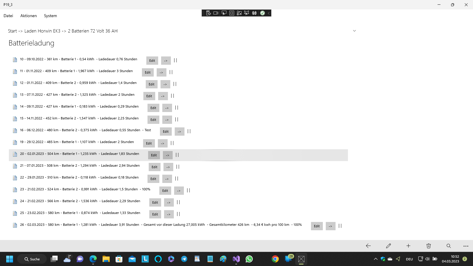 Die Aufzeichnung begann bei einem Kilometerstand von 154. Die 100% ganz hinten bedeuten das das Ladegerät angeschlossen blieb bis die Ladeleistung ca. eine halbe Stunde unter 10 Watt war. Um zu balancieren.