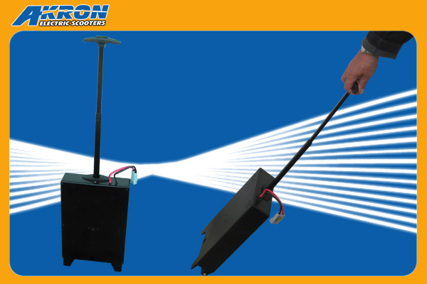 Diese 2 Packs sind sehr kompakt und stecken lustigerweise schräg drin, vermutlich um dem Rohrrahmen auszuweichen. Damit ist das Helmfach allerdings ausgefüllt. Oben aus den Packs schauen die Kabel raus, die man an und ab steckt, und -schöne Detaillösung - ausziehbare Griffe, zum Ziehen. An den Unterseiten der Packs sind für diesen Zweck kleine Rollen eingebaut.