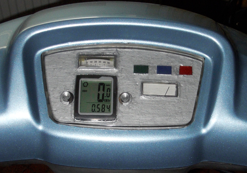 Weil u.A. auch die Tachowelle zu kurz war und daher keine Anzeige mehr stattfand, habe ich kurzerhand einen Umbau auf Digital vorgenommen, nicht zuletzt auch wegen der genauen Justierbarkeit auf den vorhandenen Radumfang: Da die Geschwindigkeit in der Ebene nicht besonders berauschend war (ca. 28 km/h), kam bei der näheren Untersuchung des Original EVT-Bürstencontrollers heraus, dass dieser bei Vollstrom nicht 100% durchschaltet, sondern ca. 90% EIN und 10% AUS-Impulse rausgibt und das im Power-Modus.