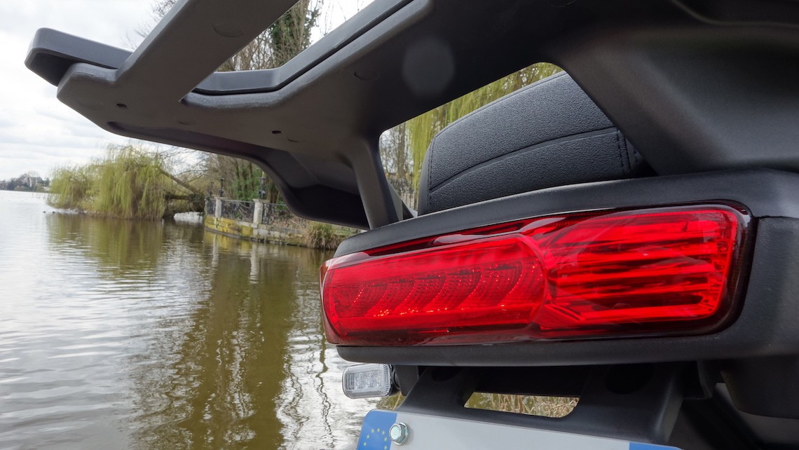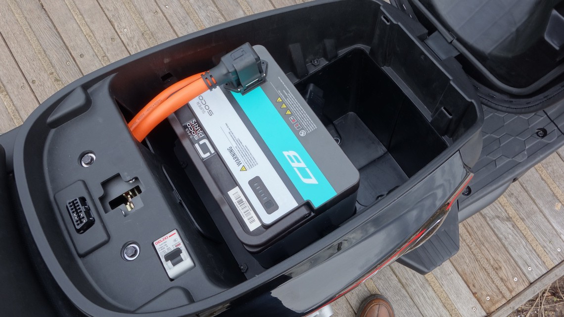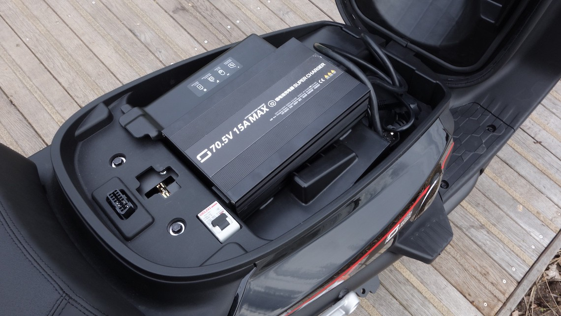- Es gibt einen Lagerplatz für das Ladegerät unter der Sitzbank, aber offenbar keinen dauerhaften Anschluss