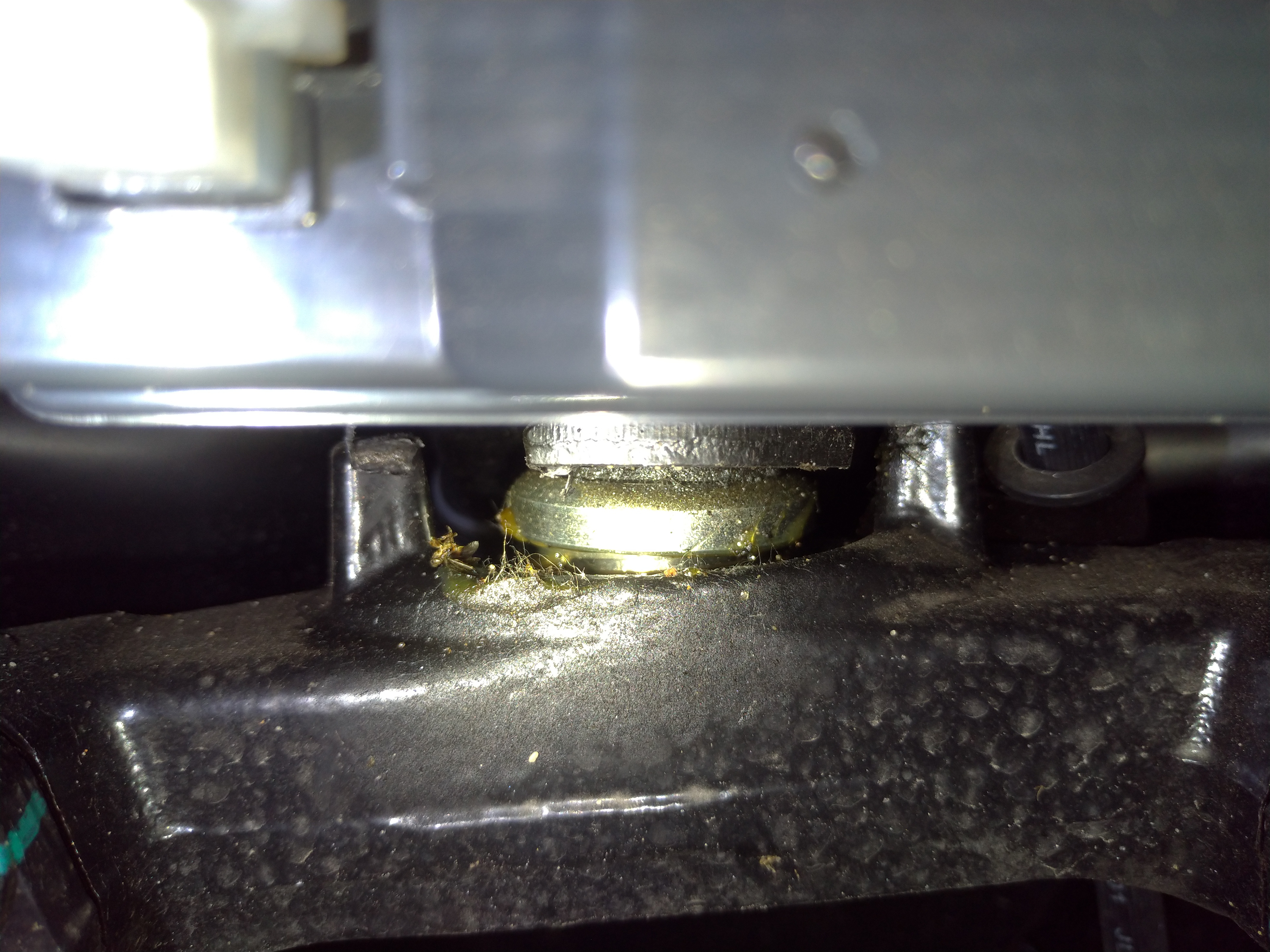 Da habe ich dann mal die Frontverkleidung abgeschraubt. Man kann recht gut erkennen das sich die Gabel vom Steuerrohr leicht getrennt hat bzw. sich seitlich ein wenig raus gezogen hat.
