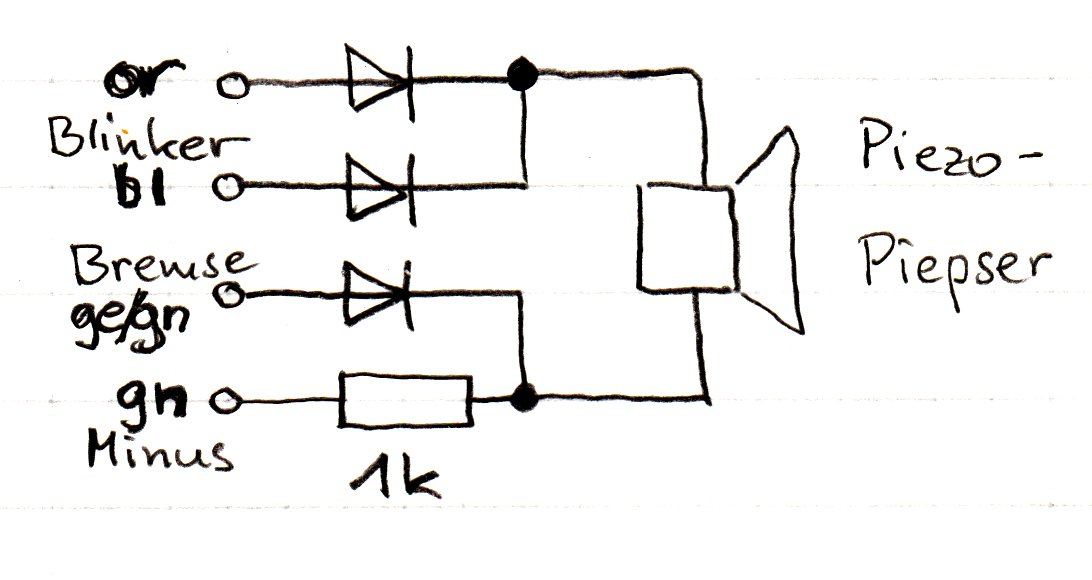 Geht tatsächlich einfach mit zusätzlich einem Widerstand und einer Diode: Der Piepser piepst synchron zum Blinker, er ist etwas geräuschgedämmt durch den Widerstand, macht aber nichts. Wird die Bremse betätigt, gelangt deren Versorgungsspannung ebenfalls auf den Widerstand - somit gibt es für den Piepser keine Spannungsdifferenz mehr und er bleibt stumm. Beim Bremsen vor der Ampel und im Stand mit gezogenem Bremsgriff passiert also nichts, egal wie lange die Rotphase ist. Sobald ich losfahre, piepst es wieder und macht parallel laufende Fußgänger und Radfahrer auf mich aufmerksam. Für mich ist das optimal...Pfriemler hat geschrieben: ↑Mi 26. Jun 2019, 22:112) Bremslicht als "Fußpunkt" war ja als Option gedacht, durch Ziehen der Bremse den Piepser zu deaktivieren. Prinzipiell funktioniert das - aber leider sind die LEDs sehr effizient - schon 1 mA erzeugt ein deutlich sichtbares Mitblinken der separaten Bremslicht-LEDs (auf den Leisten sieht man es nicht). Klappt also so nicht, aber ich vermute, dass schon ein gut dimensionierter Zusatzwiderstand als Last das Spektakel beendet... Oder ... Transistor... oder ... 4093 ...
