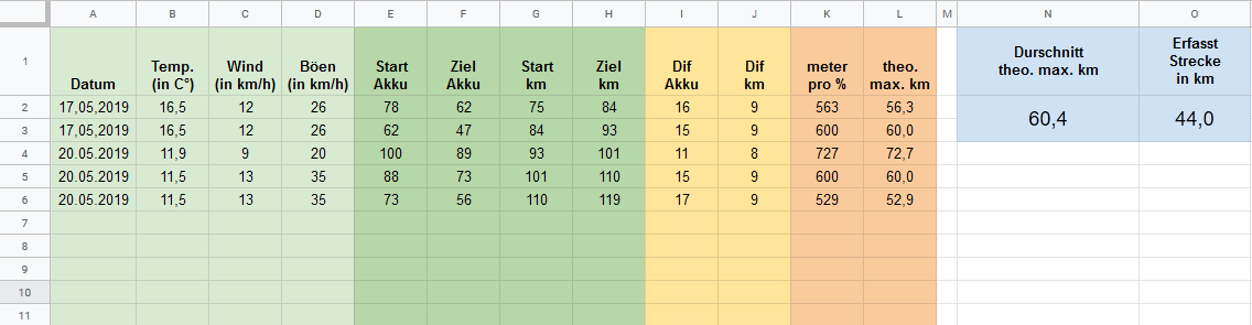 Aber die Werte sehen schon bei über 50% Akku eine ganze Ecke besser aus wie meine. Bei mir geht es ja erst bei 530 m/% los und sinkt dann bei 50% Akku auf 400 m/%. Ich fahre wohl wie eine wilde Sauescape hat geschrieben: ↑Mo 20. Mai 2019, 18:00Ich hab mir deine Liste mal zum Vorbild genommen und an einem eigenem "Fahrtenbuch" gewerkelt.