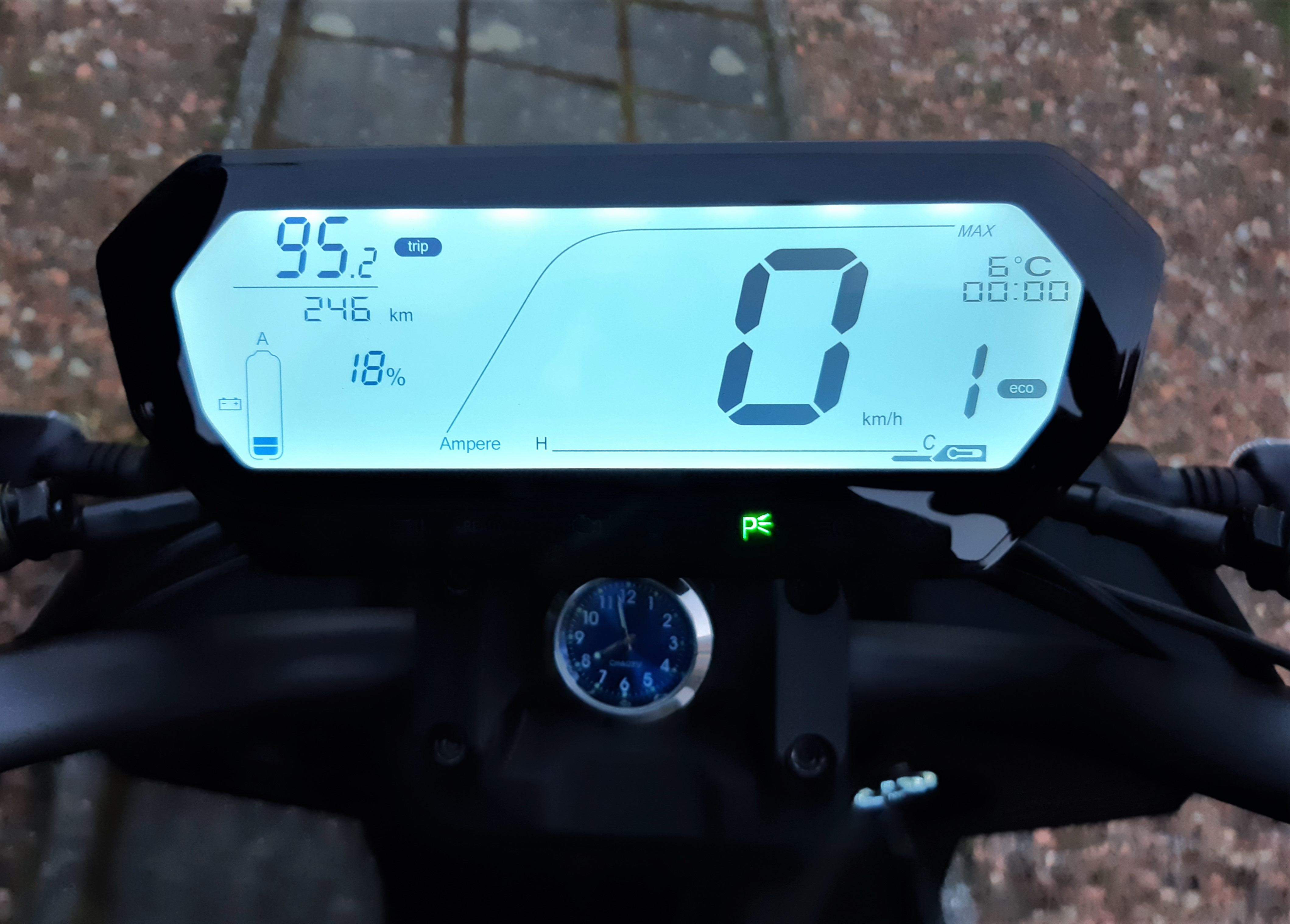 Reichweite Super soco CPx Mofa 30 km snell in der Niederlande standard nur mit 1 batterie geliefert bei 6 grad eine reichweite von 95 km mit einen rest von 18 %
