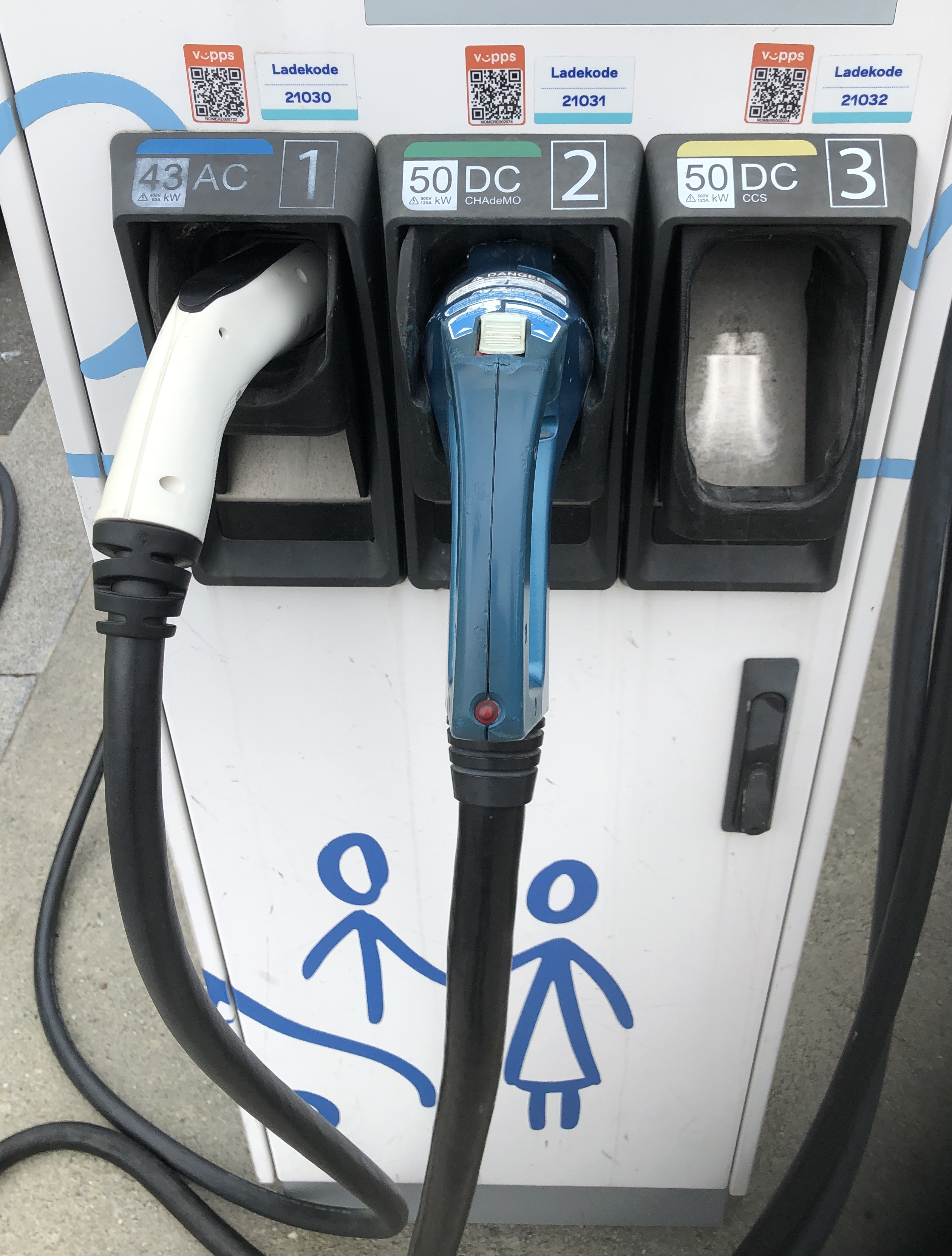 Die Tripple-Charger mit angeschlagenen Kabeln gibt es auch hier in Deutschland noch, aber sie sterben langsam aus, da schon seit vielen Jahren im Einsatz und auf 50kW DC-Ladung beschränkt. Was das zu diesem Thread beitragen sollte ist mir aber nicht klar