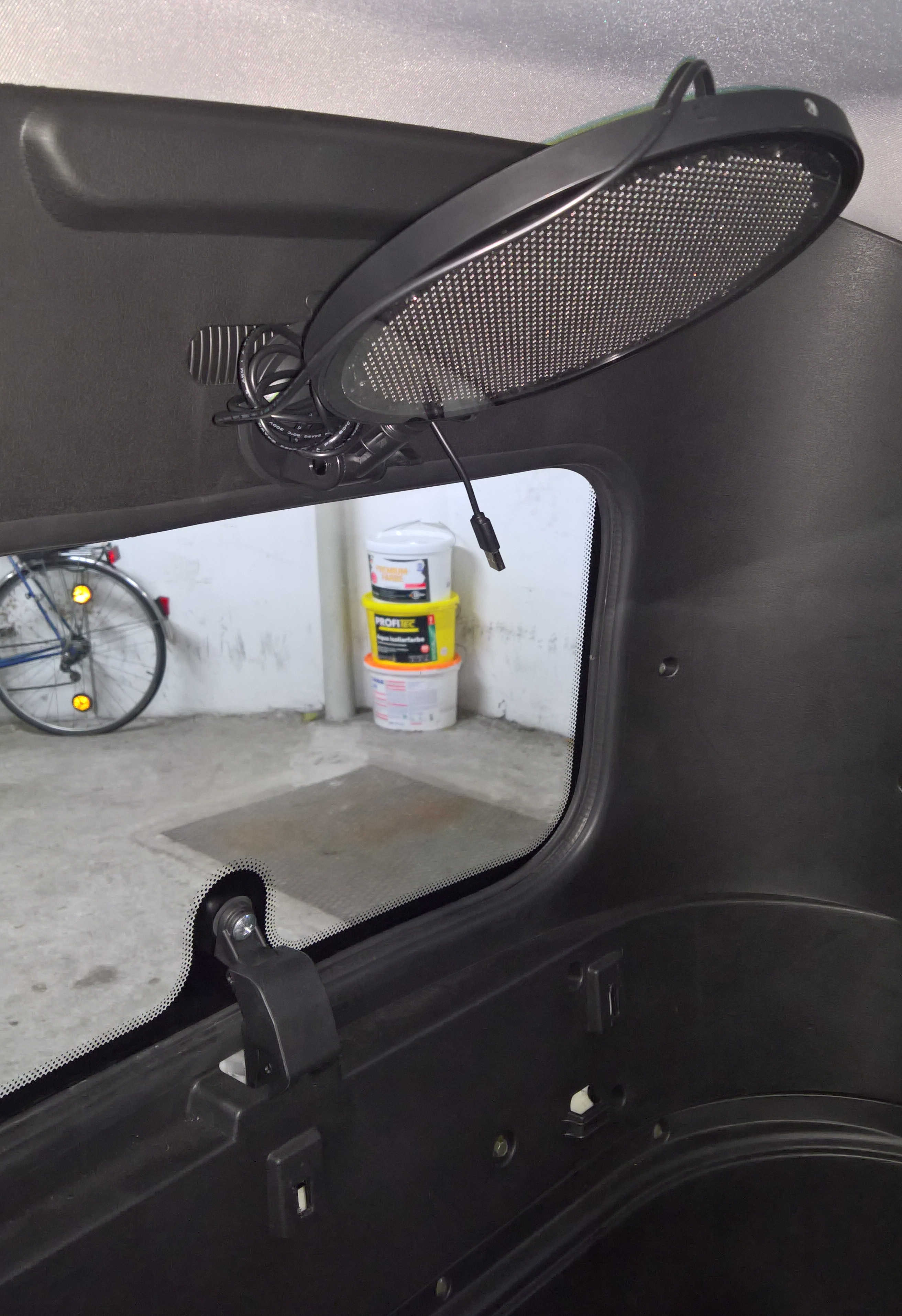 3) lässt sich einfach befestigen und herausnehmen: Schraube ins Loch auf der Rückseite + Alu-Winkel zurechtbiegen, anschrauben, mit Isolierband ummanteln, damit nichts zerkratzt wird, und zwischen Heckscheibe und Gummidichtung einklemmen