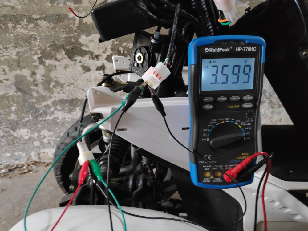 Das Problem ist wieder aufgetreten, also beschloss ich, den Gasgriffsensor zu ersetzen. Dafür habe ich mir auf Amazon ein günstiges Daumengas gekauft. Habe es provisorisch mit Krokodilklemmen angeschlossen und die Steuerspannung gemessen.