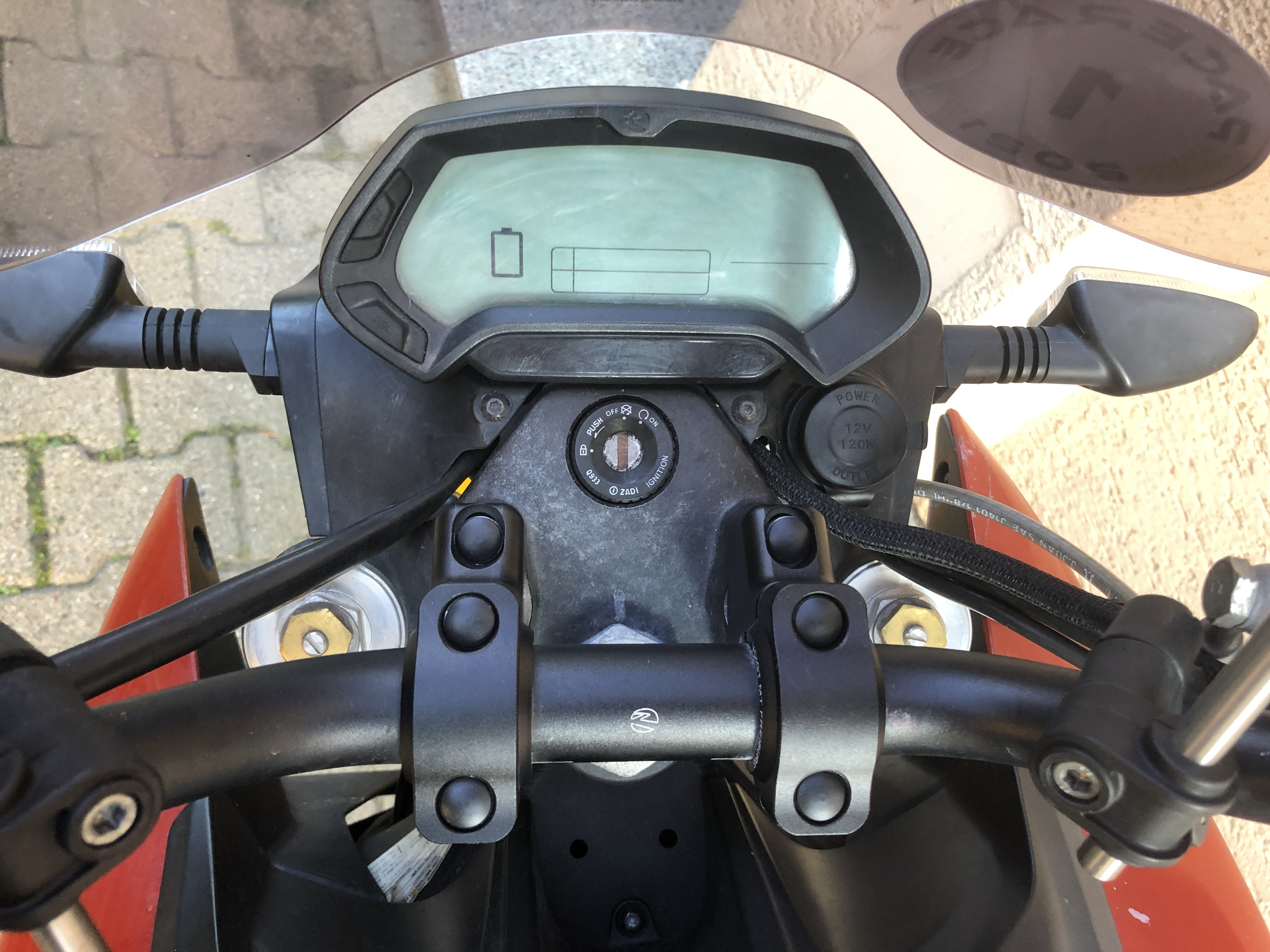 Jetzt ist erstaunlich viel Platz vor dem Lenker, und speziell das Kabel von der linken Lenkerarmatur spannt noch etwas mehr als vorher: Von der Seite sieht man gut den Versatz in Z und in X Richtung: Das Windschild musste ich natürlich auch anpassen. Die kurze Fahrt vom Montageplatz im Schatten auf den Stellplatz hat mir sofort die neue Sitzposition aufgezeigt.