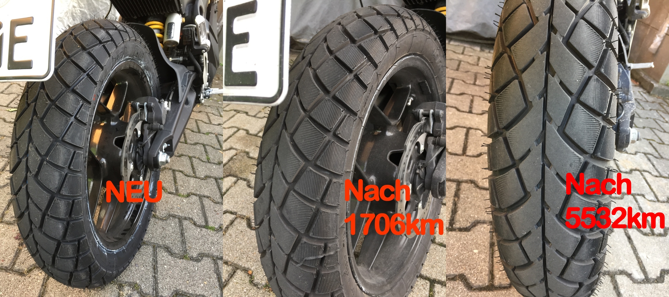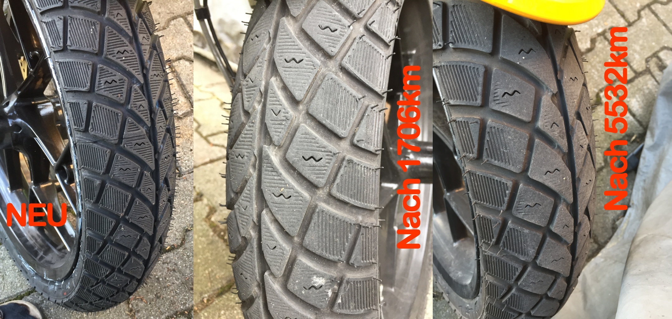 Die feinen Rillen haben sich jetzt auf die äußersten Ecken der längeren mittleren Profilblöcke zurückgezogen. In der Mitte ist es inzwischen recht abgerubbelt. Keine Ahnung, wie lange die noch halten - vielleicht nochmals 5000km?