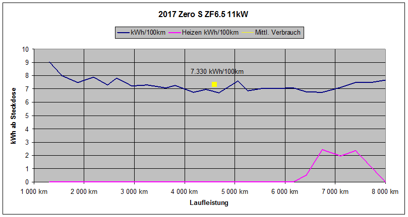 Der Mittlere Verbrauch hat sich bei sehr moderaten 7,33kWh / 100km eingenistet. Nur für etwa 1800 Winter-km musste ich unterm Zelt heizen, was zusätzlich den Magenta-farbenen Heizverbrauch beschert hat:
