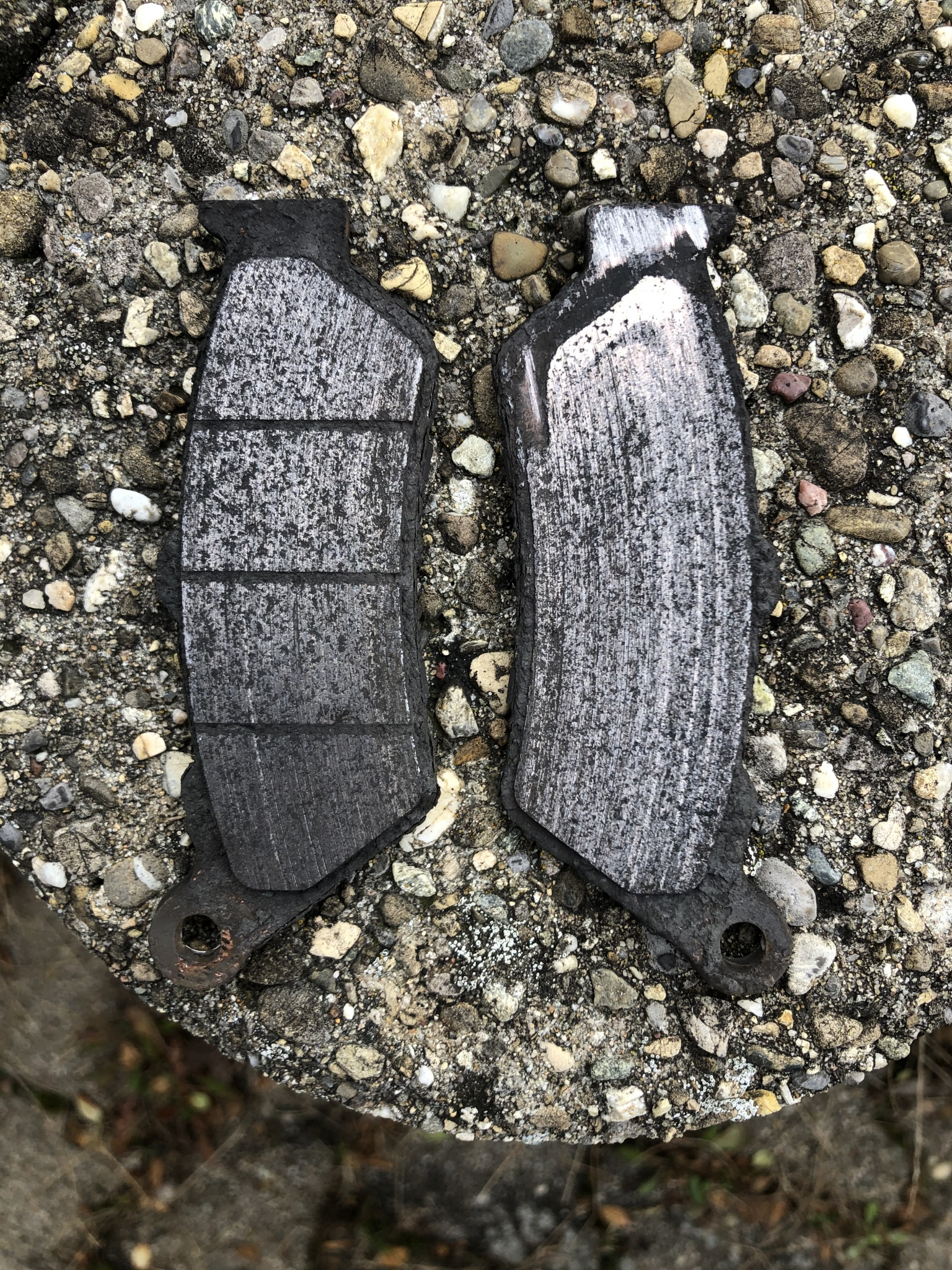 Der alte innere Bremsbelag war eigentlich komplett weg, man sah nur noch seine Umrisse auf dem Halteblech