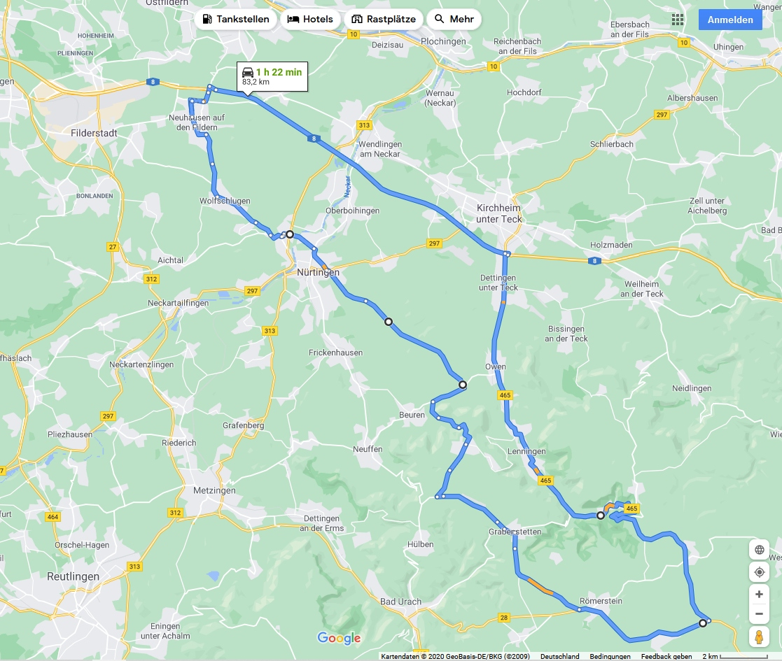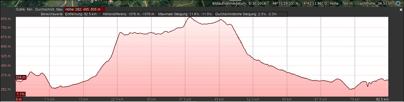 Es wurde eine wunderbare Alb-Rundfahrt, mit 1076m Höhendiffernz, auf maximal 835m über NN. Laut Zero betrug die bunt gemischte Runde 83,8km, laut GoogleMaps 83,2km. Manche Ortsdurchfahrt mit teils unter 30km/h war dabei, viel Überland mit 70 bis teils 116 (