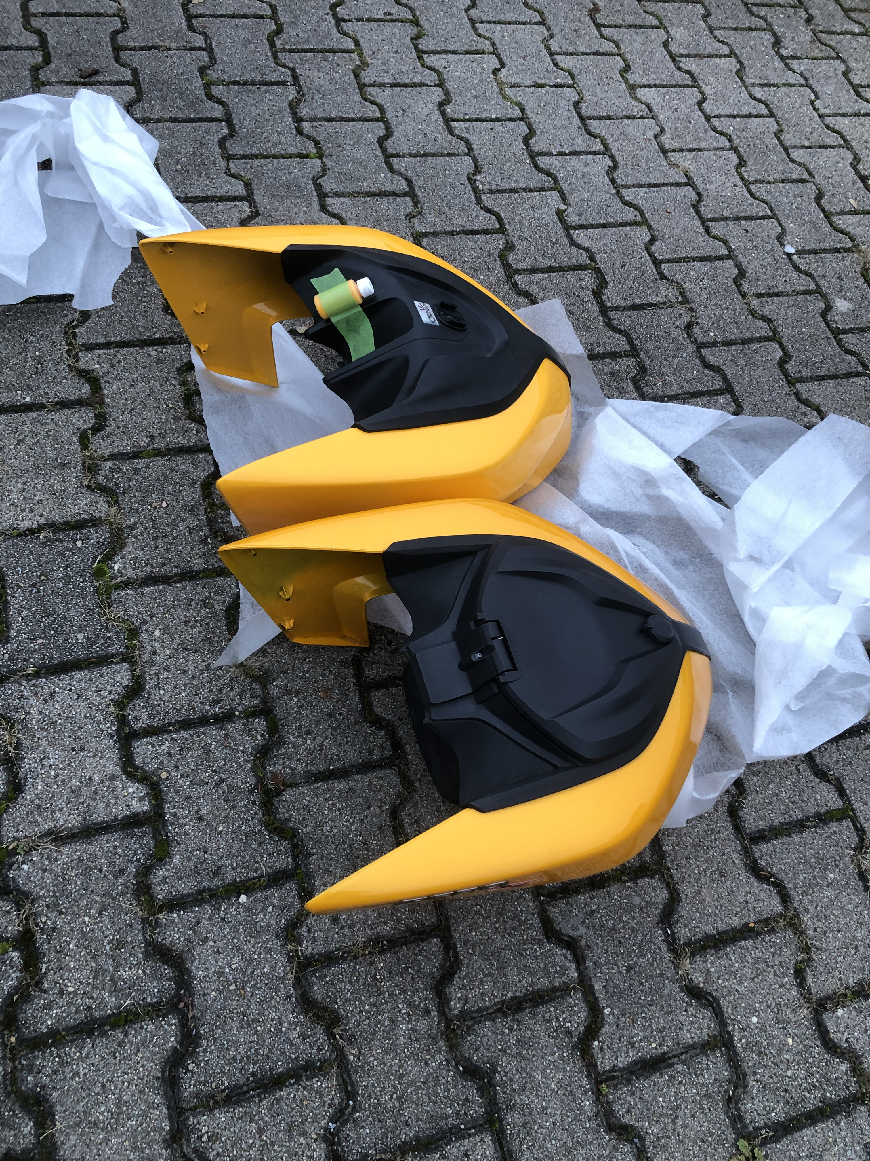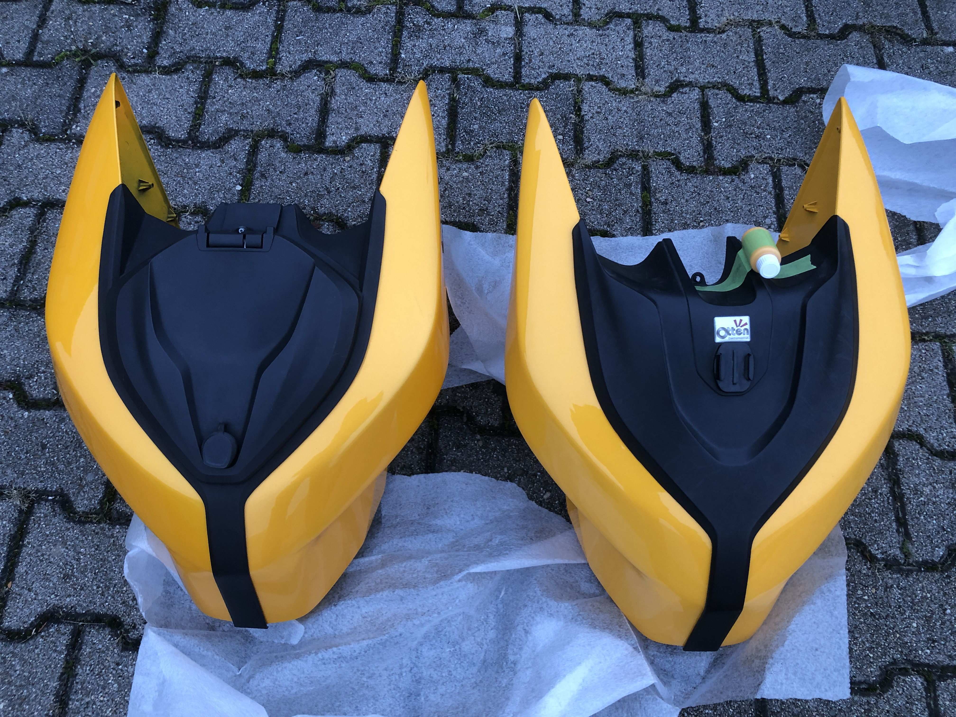 Sogar ein Farbfläschchen für eventuelle Reparaturen habe ich erhalten. Es gab eine dünne Grundierung, darüber dann das Gelb, am Schluss eine Schicht Klarlack. 290€ hat mich der Spaß jetzt gekostet - weniger als die Hälfte vom Originalteil von Zero, und etwas nachhaltiger.