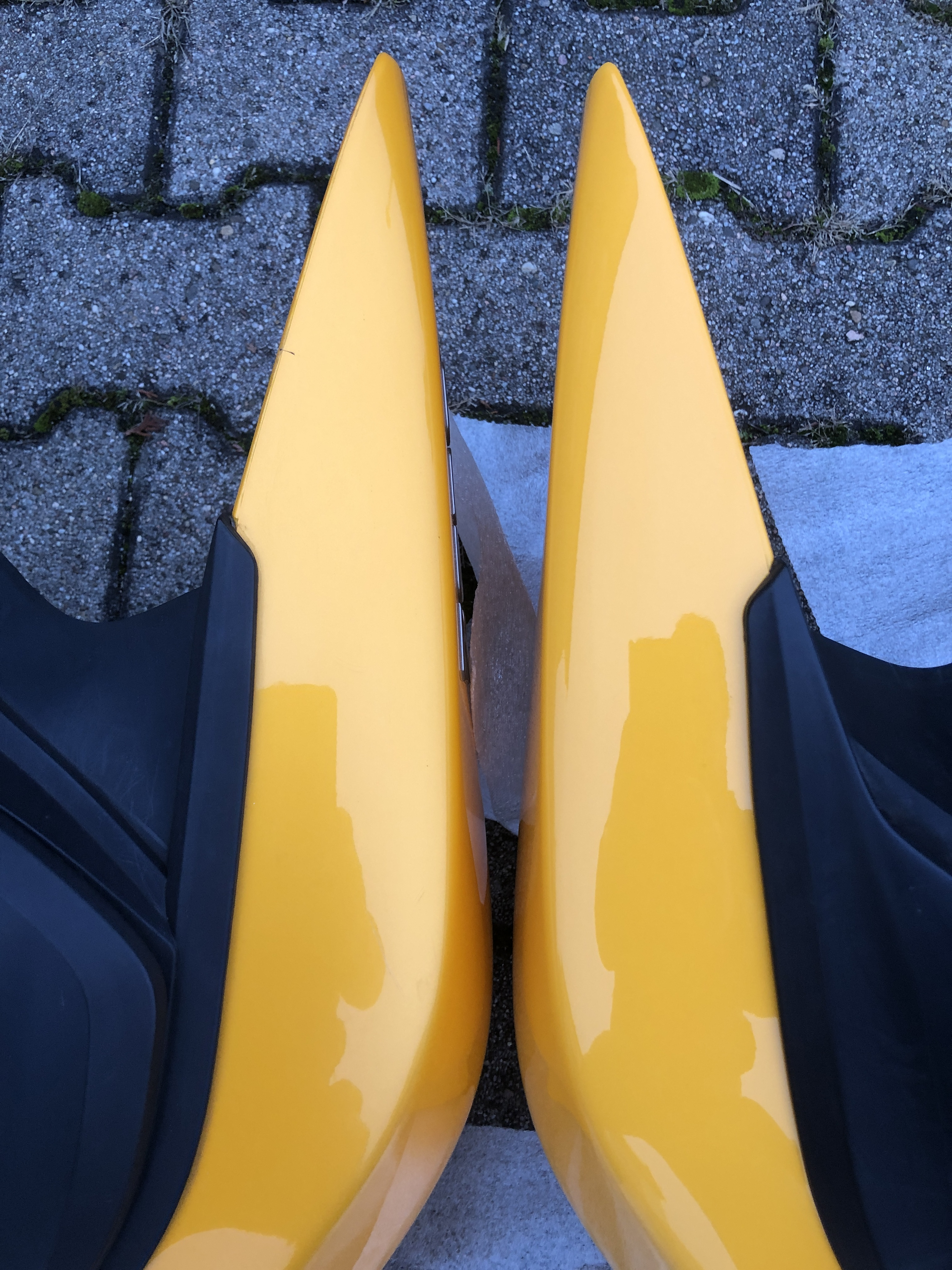 Und die neue Farbe ist auf jeden Fall leicht anders, wie ich schon sagte etwas weniger Rotanteil, sprich etwas gelber als das leichte Orange des originalen "Hot Rod Yellow". Und ich erwarte bei direktem Sonnenlicht weniger Tiefe beim Perleffekt, da dieser schon dem Lack beigemischt war, nicht als separate Schicht "Yellow Pearl" wie bei der Originallackierung.