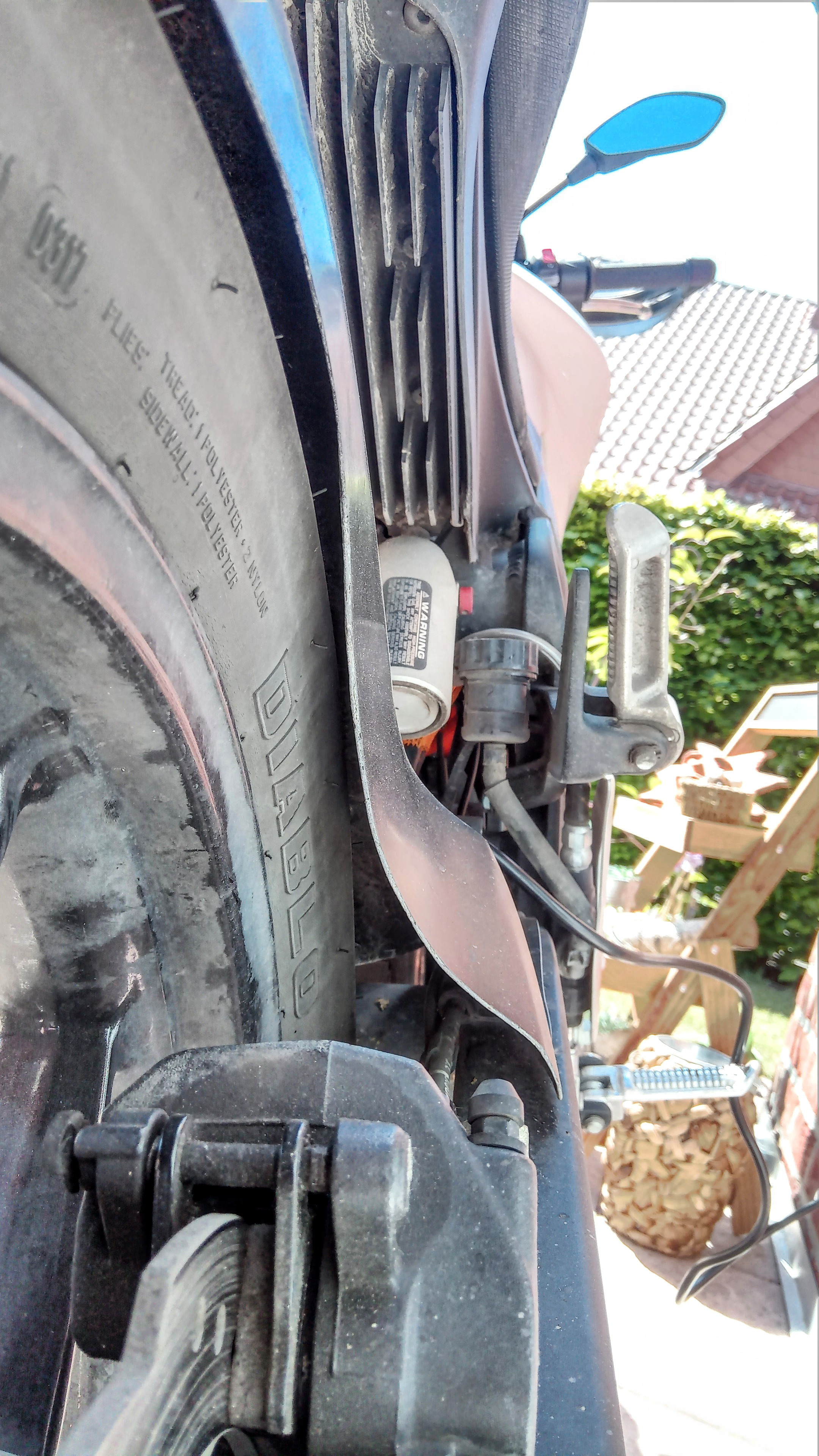 1. Erkenntnis: der nach hinten auskragende Spritzschutz schlägt bei Straßenschäden gern auf den Reifen. Vielleicht kann eine Edelstahl-Schlauchschelle links und rechts um die Swingenarme gespannt einem habhaften Draht-oder Alubügel ausreichend Halt geben, um das hintere Spritzschutzende abzustützen? Eine komplette 100% Kurzarbeitswoche eröffnet ganztägige Garagen-Zeitfenster :D