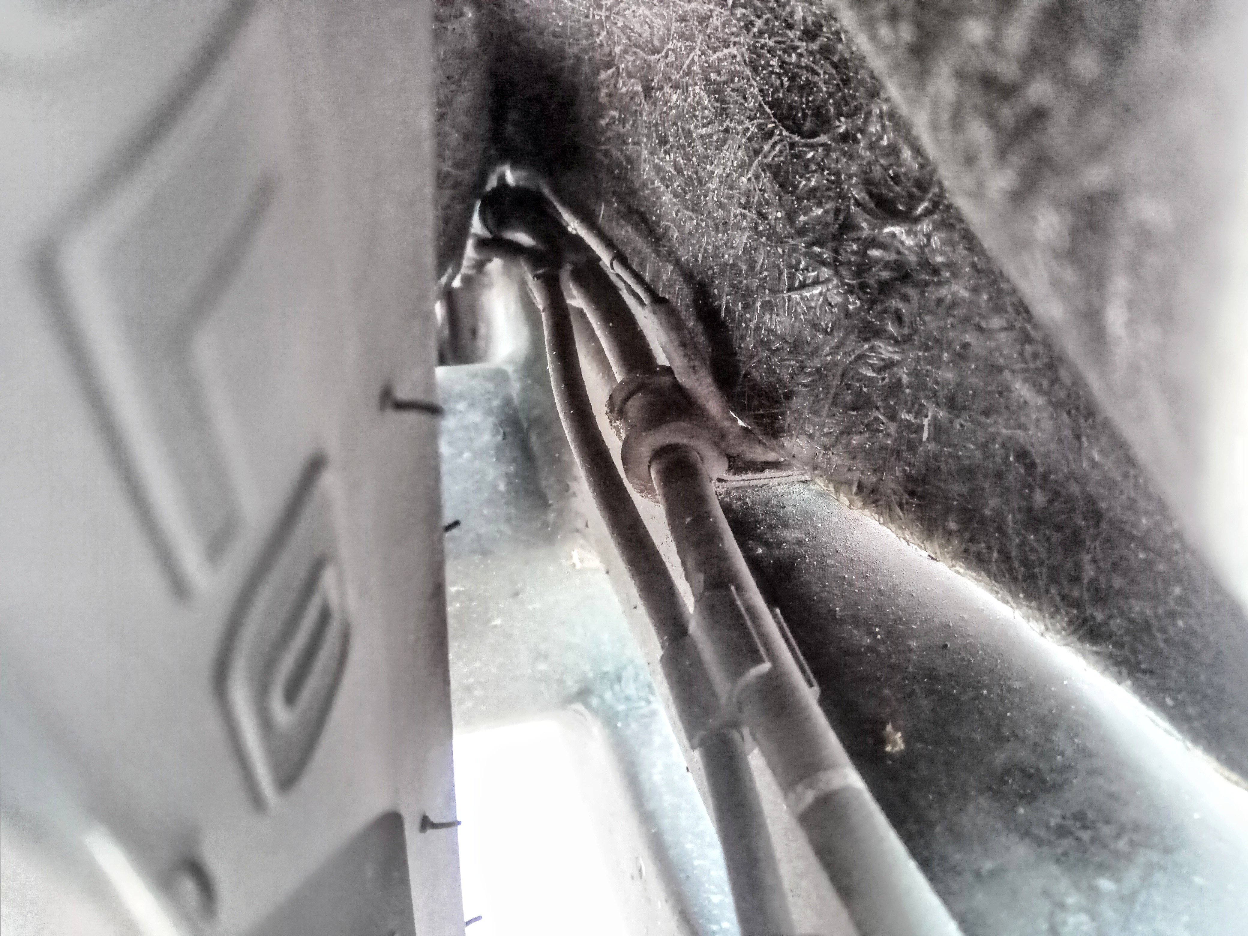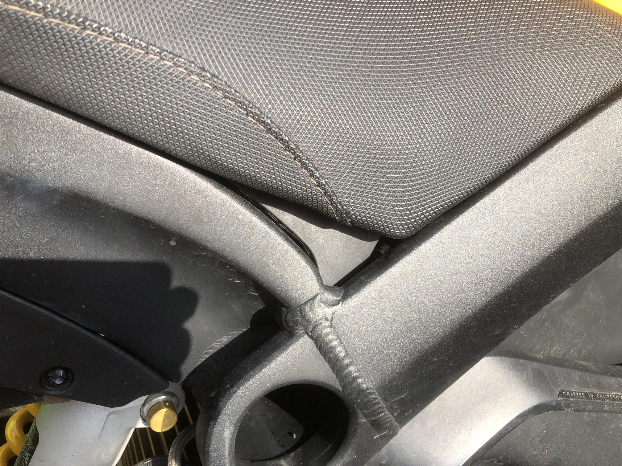 Das Dreieck zwischen Sitzbank und zwei Rahmenteilen war vorher offen, so dass die orangefarbenen Kabelhüllen herausleuchten und Regentropfen hereinregnen konnten: