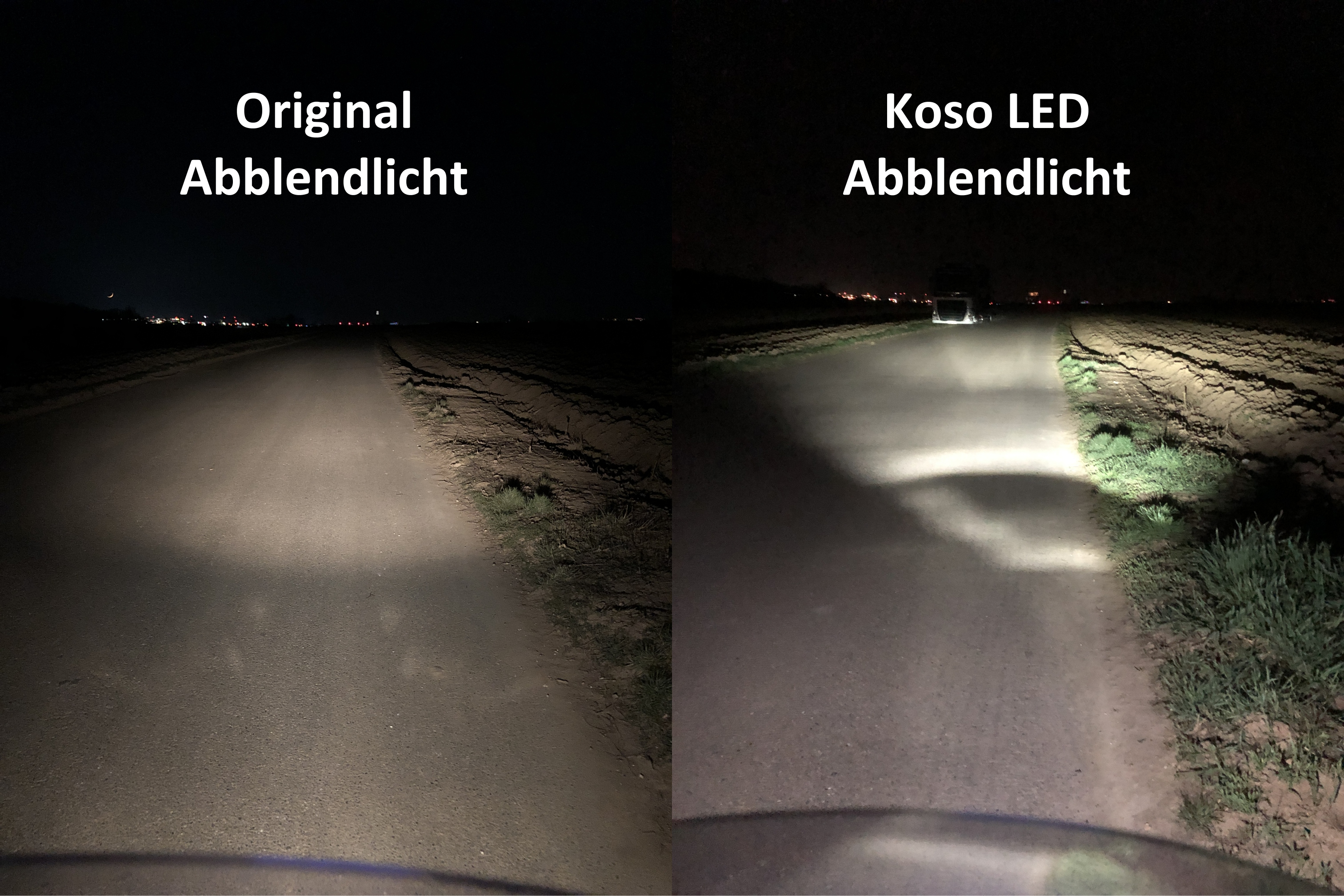 Abblendlicht ist wirklich phänomenal, leuchtet viel breiter als die originale Funzel, und weit heller: Fernlicht spart tatsächlich den Nahbereich etwas aus und ist da fleckig, aber leuchtet weiter vorn ebenso phänomenal wie das Abblendlicht: Der Umbau hatte also die erhoffte Wirkung