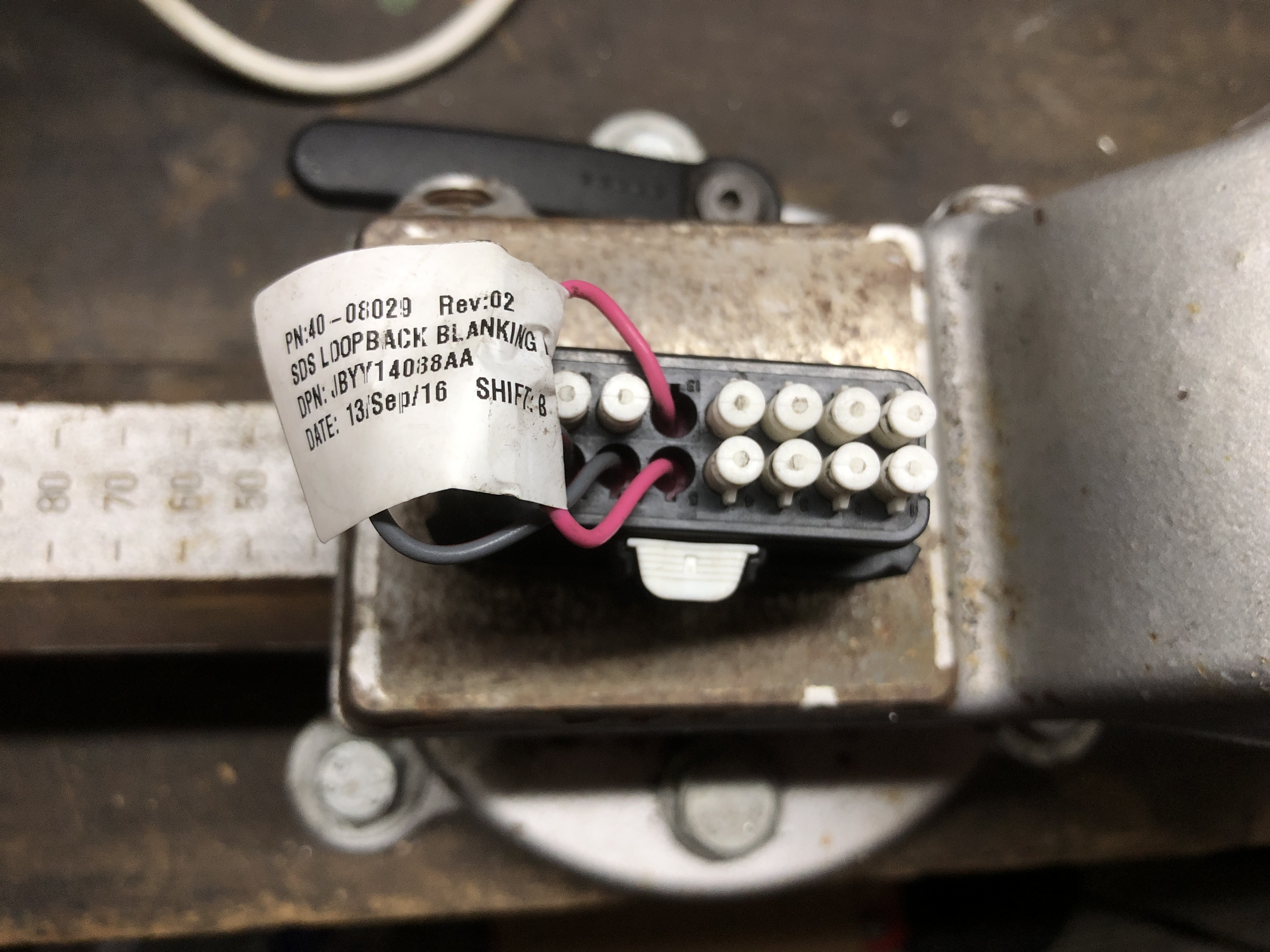 So sieht der "Leer"-Stecker von oben aus, wo man deutlich belegte Kabelbrücken sieht, welche ohne PowerTank den Betrieb der Zero ermöglichen (siehe "Loop Back" auf der Fahne mit Teilenummer). Der lag im Staufach der Originalen "Tank"Verkleidung, in meiner Garage :lol: