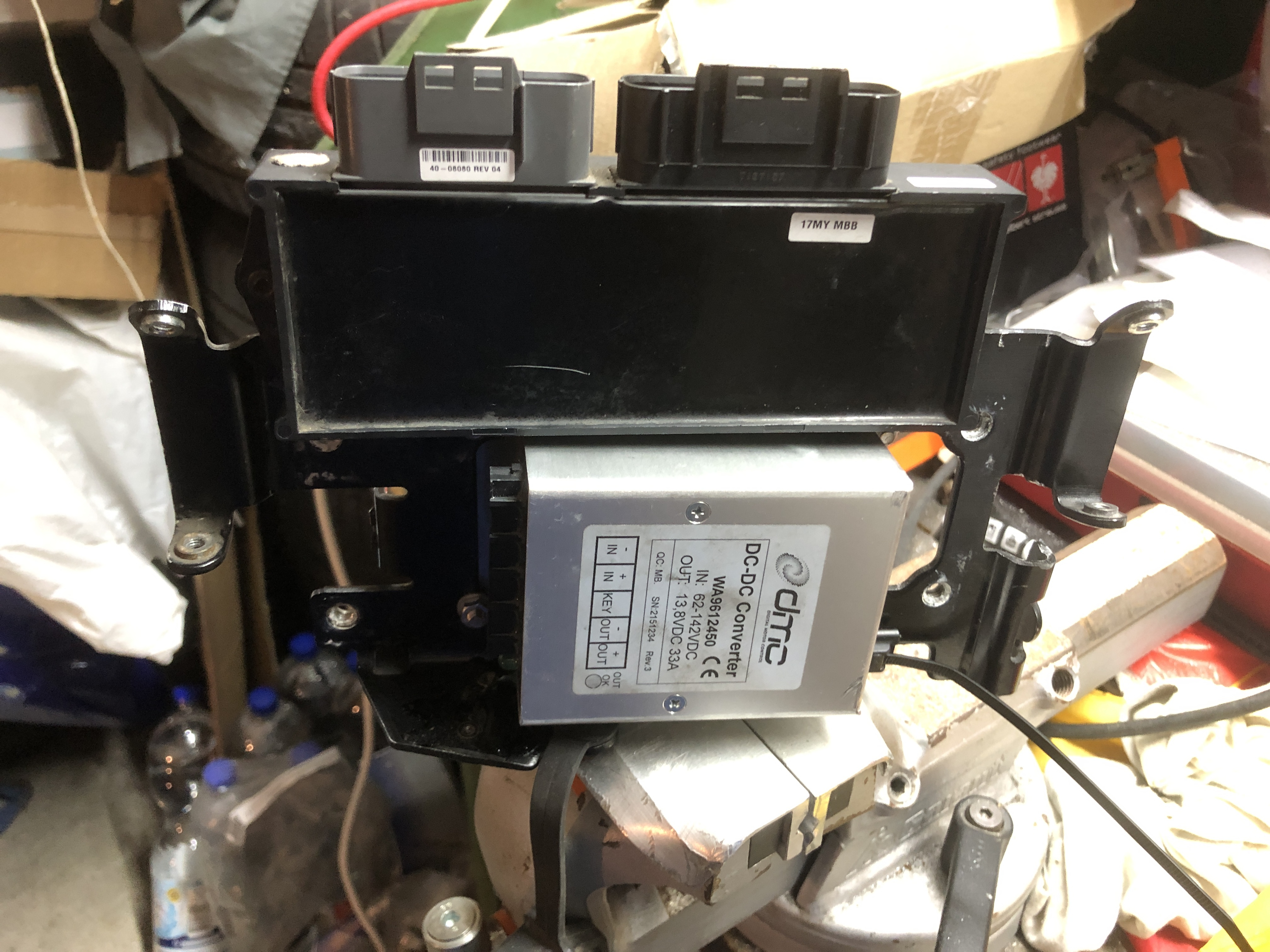 Hier die Sicht von hinten nach unten, Richtung DC/DC-Wandler. Der Anderson Schenllladestecker guckt unten noch raus, weil ich ihn nicht abgeschraubt bekommen habe, und das verhindert den vollständigen Ausbau der Platine: .