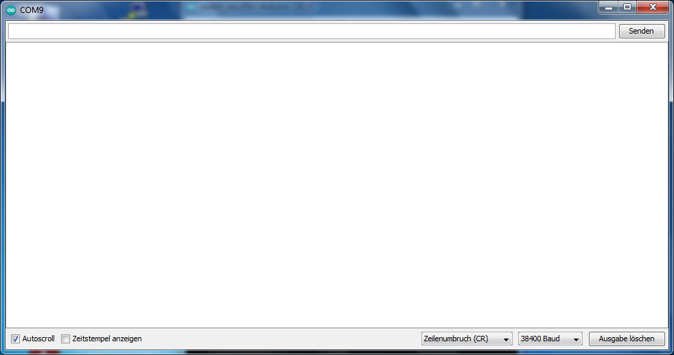 Unten links "Autoscroll" anklicken. Unten, im dritten Fenster von rechts "Zeilenumbruch (CR)" auswählen. Rechts daneben "38400baud" auswählen.