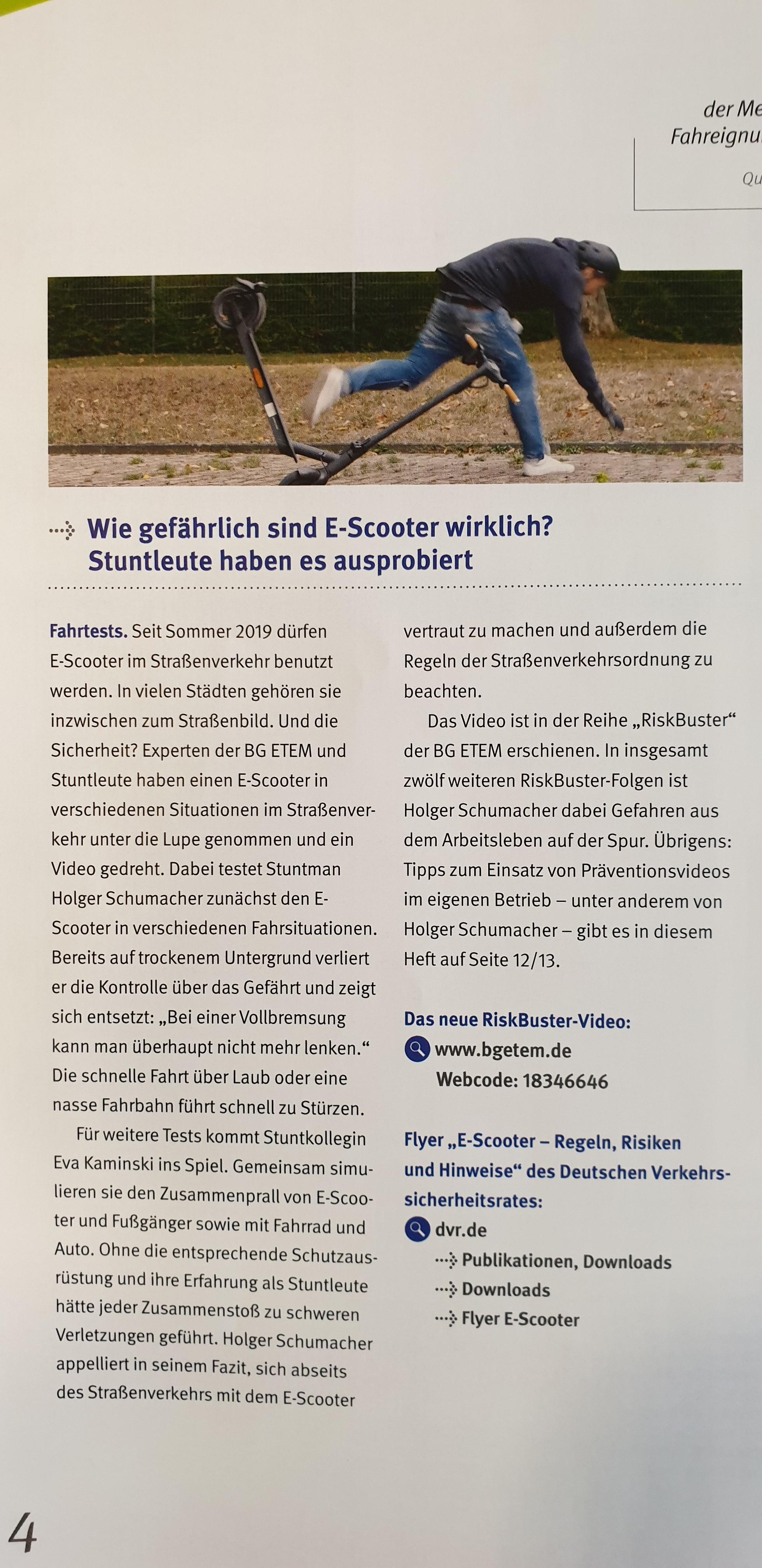 Nun, wenn eine „Berufsgenossenschaft“ die zudem auch für den Medienbeeich zuständig ist so etwas inziniert, wollen sie auch ihre 15min Ruhm (in der „suare Gurken Zeit“ wenn die Politik Sommerpause macht). Die auf der gleichen Seite präsentierten Fahrradunfälle von dem Stuntteam halte ich da für noch bedenklicher. Elektrostehroller können (offiziell) maximal 20km/h, mit dem Fahrrad ist man unter Umständen schneller unterwegs.