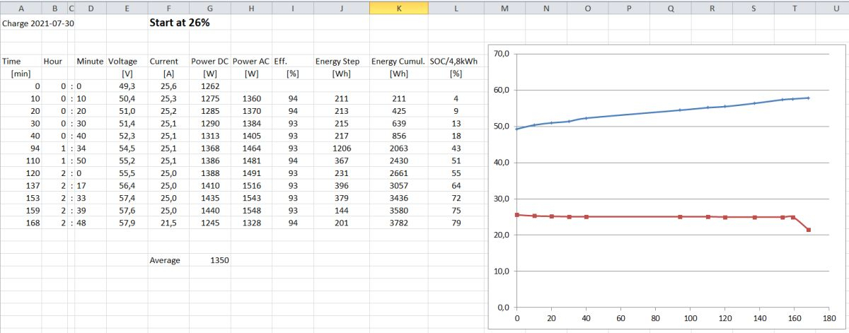 Das bedeutet dann, dass die Ladeschlussspannung beim "Spanien-Lader" wohl rein über die Ausgangsspannung des Netzteils definiert ist, und eine interne Begrenzung übergangen wird. Hast Du die Ausgangsspannung schon mal gemessen? Das eingebaute Netzteil geht ja auch bis 58,8V = 14*4,2V, die Daten von Gerold zeigen aber, dass mit den eingenbauten Netzteil nur bis 57,4 V geladen wird. Könnte natürlich einfach ein Spannungsabfall an Dioden sein. Interessant auch das Verhalten der SOC-Anzeige in dem Fall.