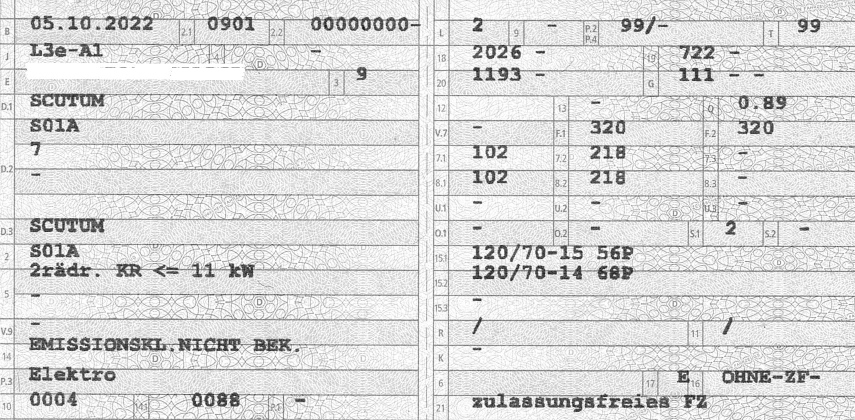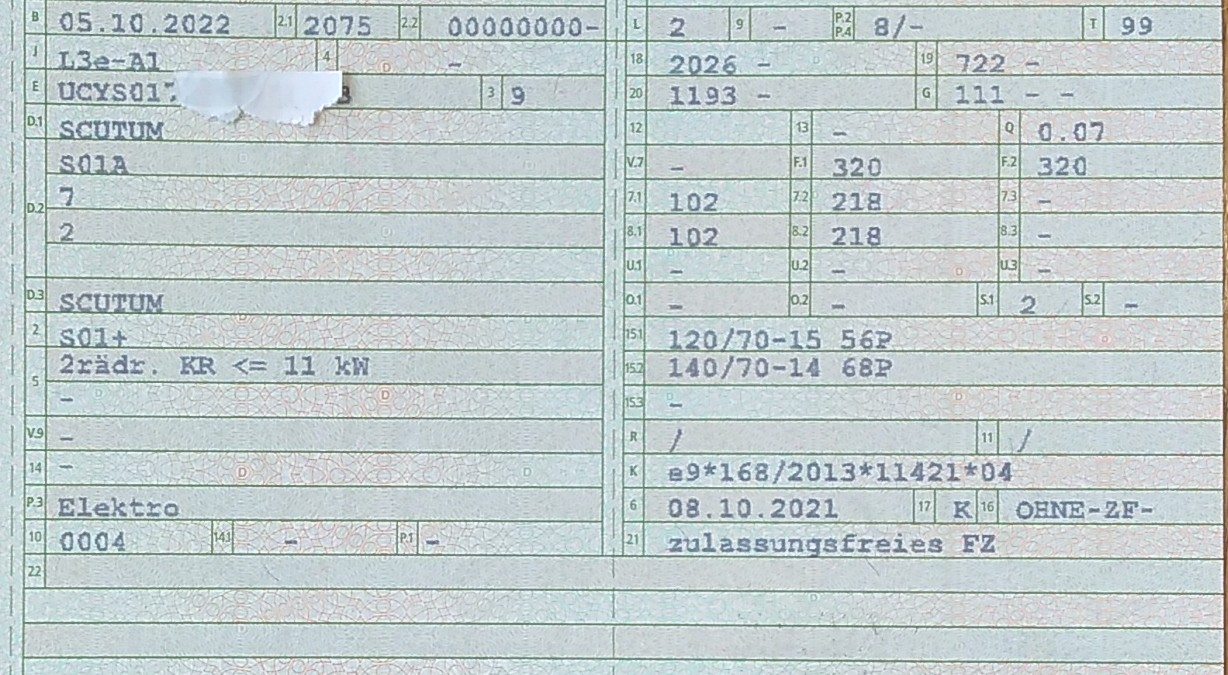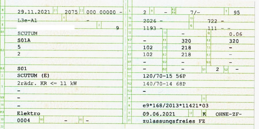 ich war doch recht erschrocken, als die Versicherung meinte, mein Silence S01 Plus hätte 99 KW Leistung und darum wäre die Jahresprämie doch um den Faktor 7 höher, als bei der EVB-Nummern-Vergabe besprochen. Die Zulassungstelle hat Fehler gemacht - nicht nur die Leistung, sondern z.b. auch eine falsche Dimensionierung des Hinterradreifens. Bevor ich noch mehr Fehler selber finde, hier ein Bild des KFZ-Scheins, mit der Bitte um Hinweise, was noch alles fehlerhaft sein könnte.