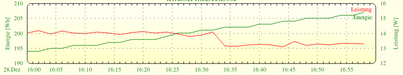 Ich habe den Akku heute extern geladen. Die CV-Phase (mit abfallender Leistung) war 47 Minuten lang, wurde bei 195 Watt beendet, danach wurden sehr konstant 2,71-2,76 Watt gezogen für 38 Minuten, anschließend "zappelte" es wieder - 7,5 Watt (nach Energiezählerwert über 4 Stunden gemittelt) bei ausgeschalteter "Beleuchtung" (mein Schalter trennt die 5V-Versorgung des ganzen Leuchtringmoduls). Die Linie quer durch die Zählerstände zeigt auch hier wieder einen durchweg konstanten Verbrauch. In der folgenden Stunde hatte ich das Licht wieder an und mittelte 9,5W, also 2 Watt mehr. (Ich habe einen neueren roten Leuchtring, Mó eben).