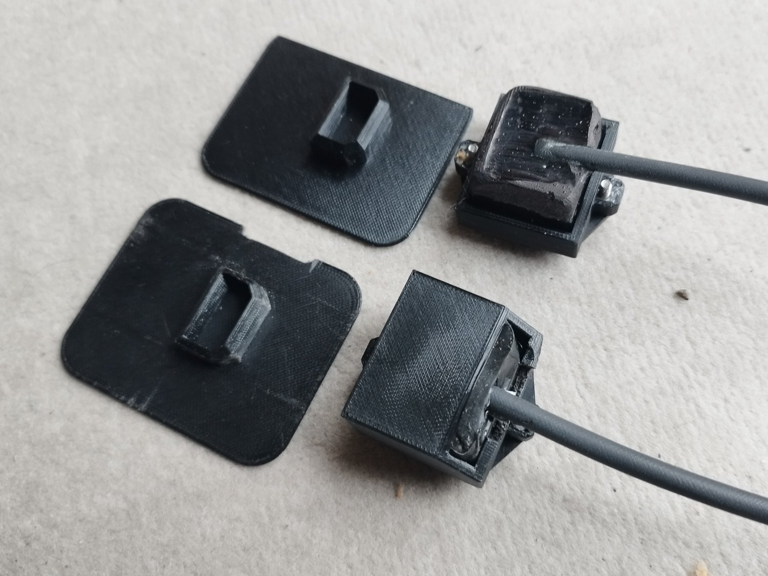 Unten mit schwarzem Silikon ausgegossen, das aber nur sehr zögerlich hart wird. Ich habe @Klaonas Abdeckkappe dafür etwas seitlich angeschnitten, musste dafür aber nachträglich noch den Schlitz vergrößern mit der Laubsäge, weil der Stecker ja nicht mehr durch passt (facepalm). So passt aber zwischen Rahmen und Kappe gerade noch eine Briefmarke.