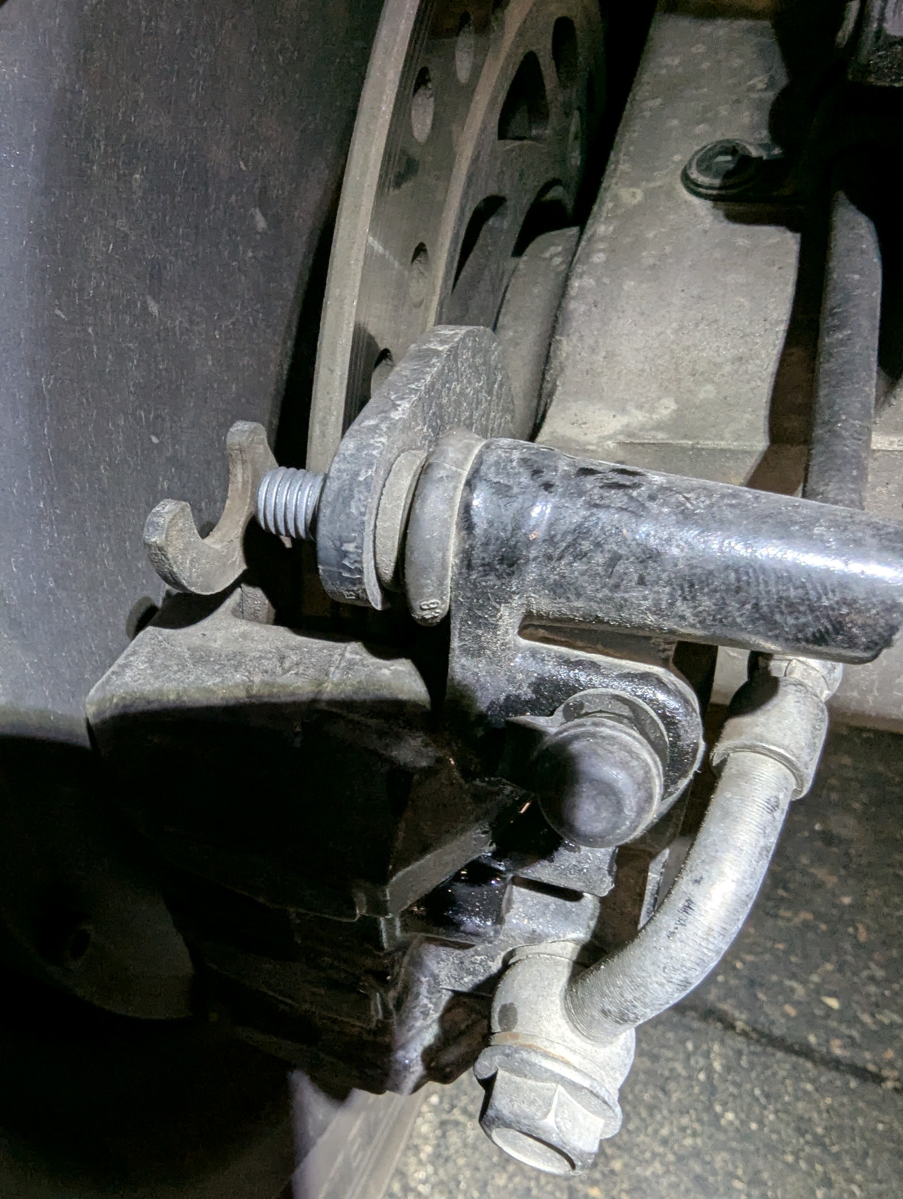 Da fehlt definitiv die Schraubhülse! Entweder hat jemand beim Wechsel der Beläge vergessen, die wieder anzuschrauben oder sie fehlte schon immer.