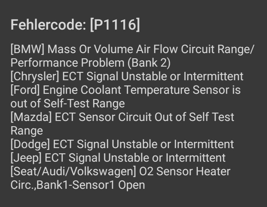 Am Ziel habe ich mit einem OBD-Dongle und Torque folgende Fehler ausgelesen (zu denen es nur widersprüchliche Erklärungen andere Hersteller betreffend gibt, wie zu erwarten)