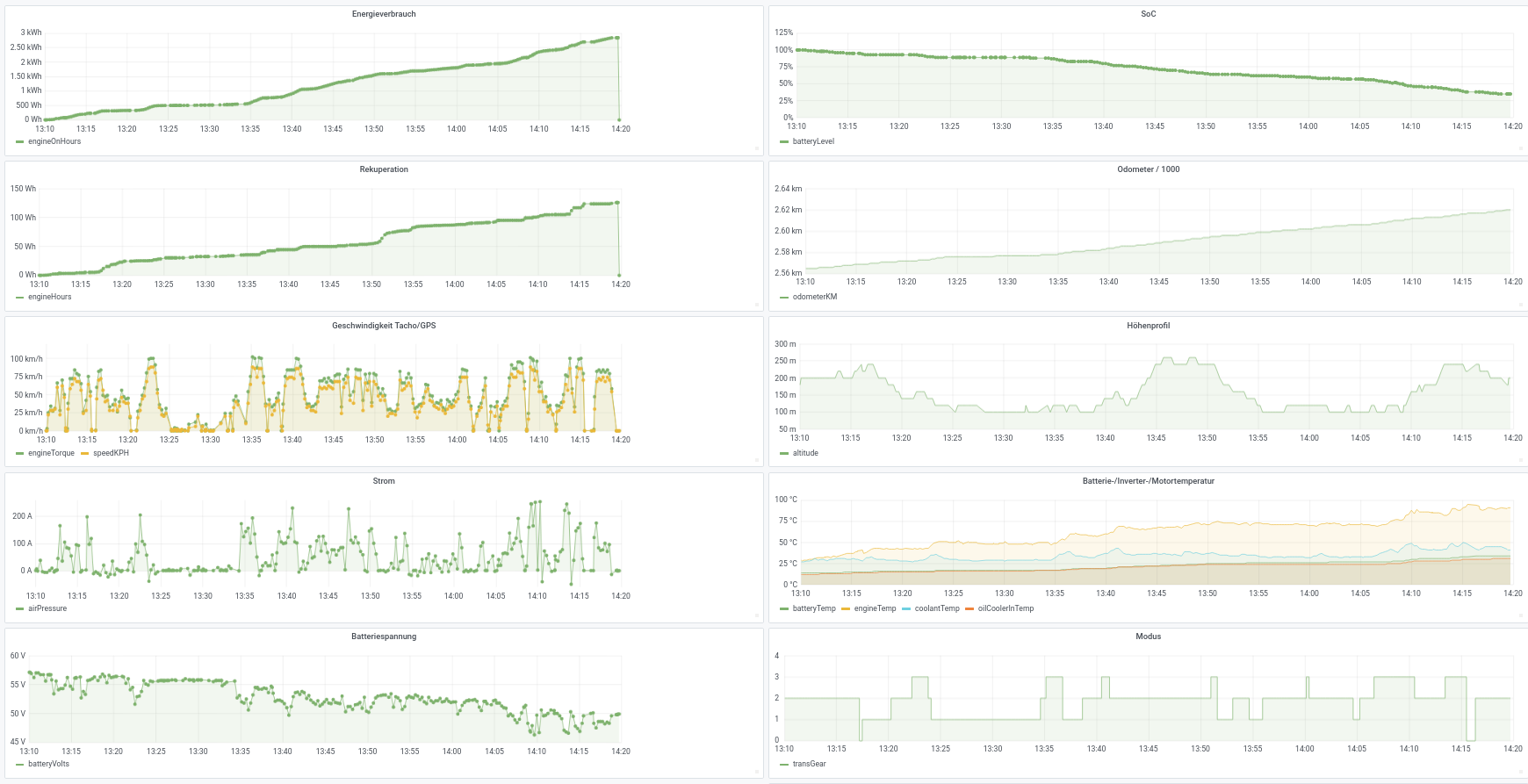 ch habe mal die wesentlichen Daten des Telemetriemoduls aus meiner letzten Fahrt durchs Rheinhessische Hügelland in eine Dashboard zusammengefasst. Dort ist dann auch der Strom-/Spannungsverlauf während der Fahrt dargestellt. Die Spitzenstromwerte lagen hier bei 250A, d.h. die elektrische Spitzenleistung liegt dann je nach Ladezustand des Akkus bei 11 bis 12kW .