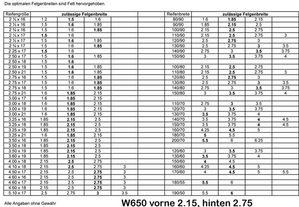 Ich bin vorne von 90/80-17 auf 100/80-17 und hinten von 120/70-17 auf 130/70-17 gewechselt. Also das Verhältnis ist gleich geblieben. Was der Prüfer noch gerne gehabt hätte, war für die Felge eine Freigabe, das die etwas breiteren Reifen drauf dürfen oder ein Datenblatt zu den verbauten Kenda-Reifen über die mögliche Felgenbreite. Aber nach dem Anschauen war zu erkennen, das es passt und es gibt auch eine Liste von möglichen Reifenbreiten/Maulweiten von Felgen (keine Gewähr für die Richtigkeit der angefügten Tabelle von mir). Der Geschwindigkeitindex muss natürlich größer als Vmax sein.