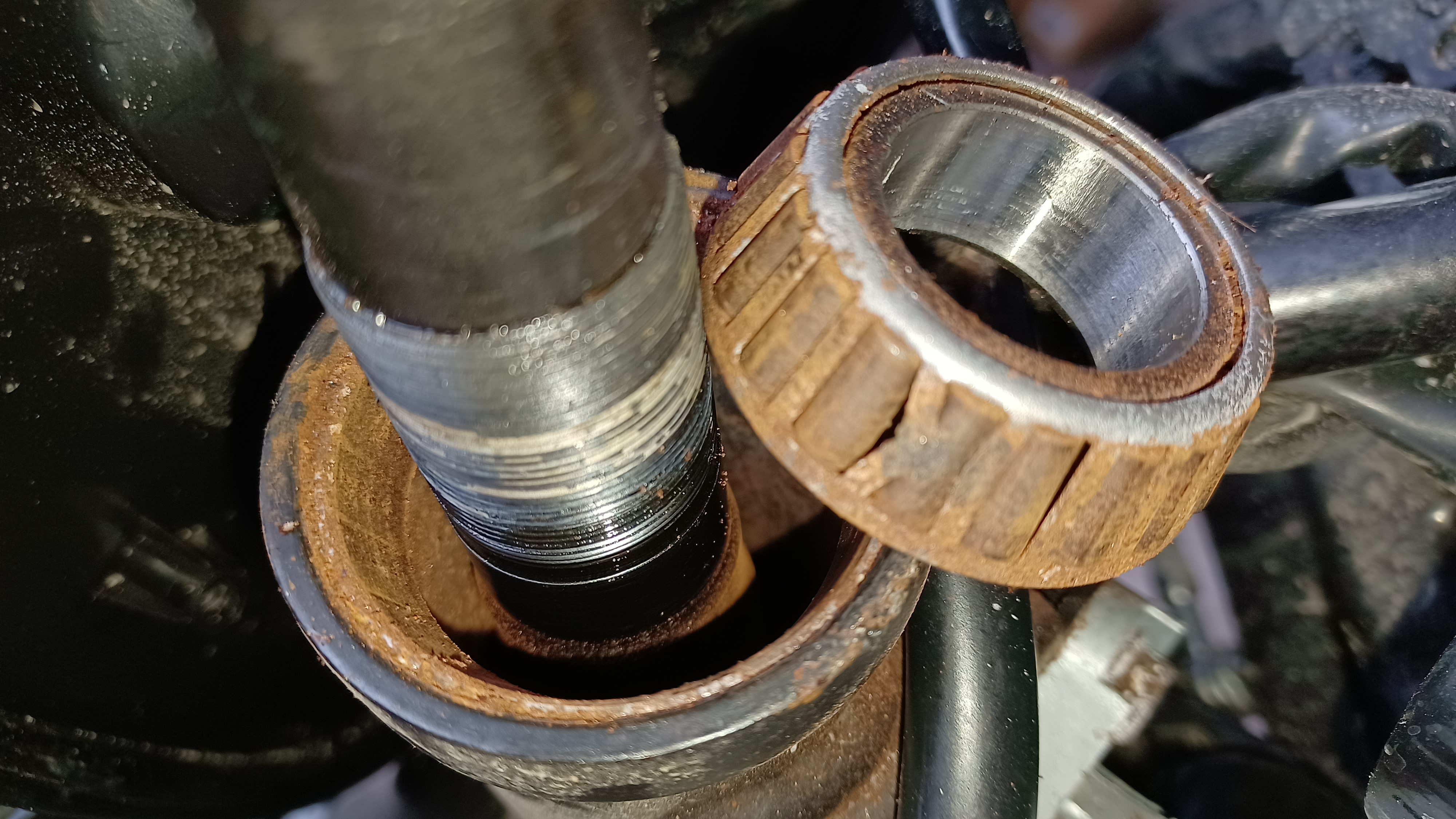 so sah gestern das obere Lager meines S01 aus. So wie das aussieht, war da niemals Fett drinnen. In einer Rechtskurve wurde die Lenkung schlagartig fest und lies sich dann nur noch mit Gewalt und mit starken Knischgeräuschen bewegen. Grenzt meiner Meinung nach schon ans Kriminelle, sowas zu verkaufen. Die Lagerschalen übrigens gehen mit Heißluftfön, Hammer und einem geeigneten Meisel schon zu entfernen.