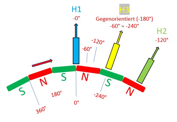 Es Tasten also verschiedene Hall-Sensoren ggf. verschiedene Magnet-Pol-Pare ab. Allerdings immer an der Winkel-Position wo der Umschaltvorgang/Nullduchgang der Phasenwelle getaktet werden muss.